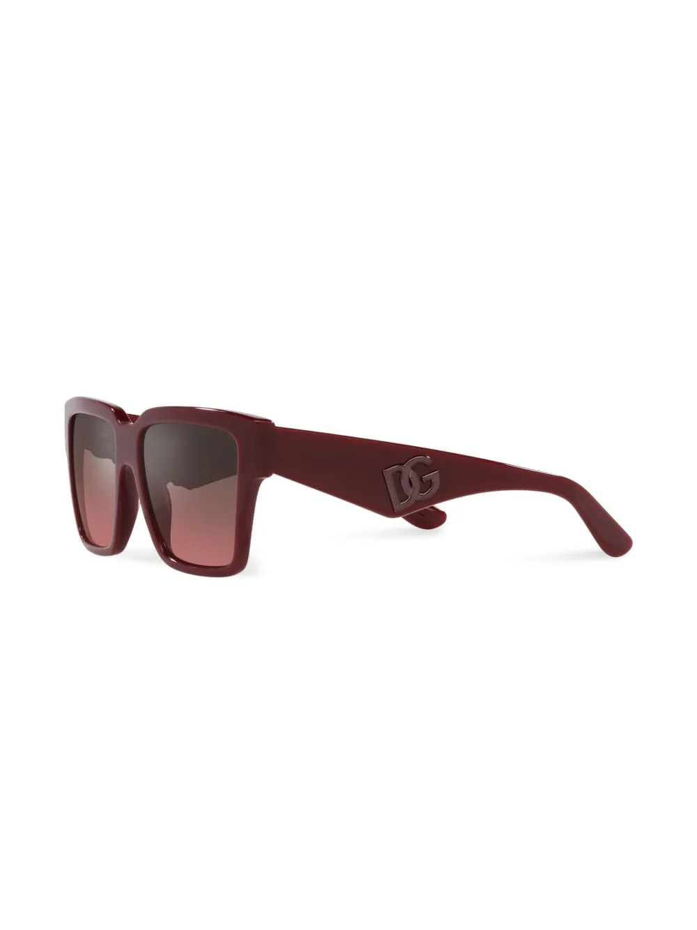Bordeauxrood, logo plakkaat, oversized montuur, vierkant montuur, rode glazen, rechte pootjes en gebogen uiteinde. Deze bril wordt verkocht met een beschermhoes..