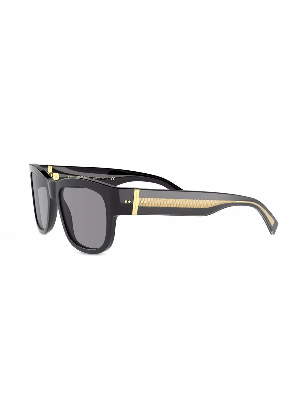 Vierkant montuur, gekleurde glazen, goudkleurig materiaal, rechte pootjes en gebogen uiteinde. Materiaal: acetaat. Deze bril wordt verkocht met een beschermhoes..
