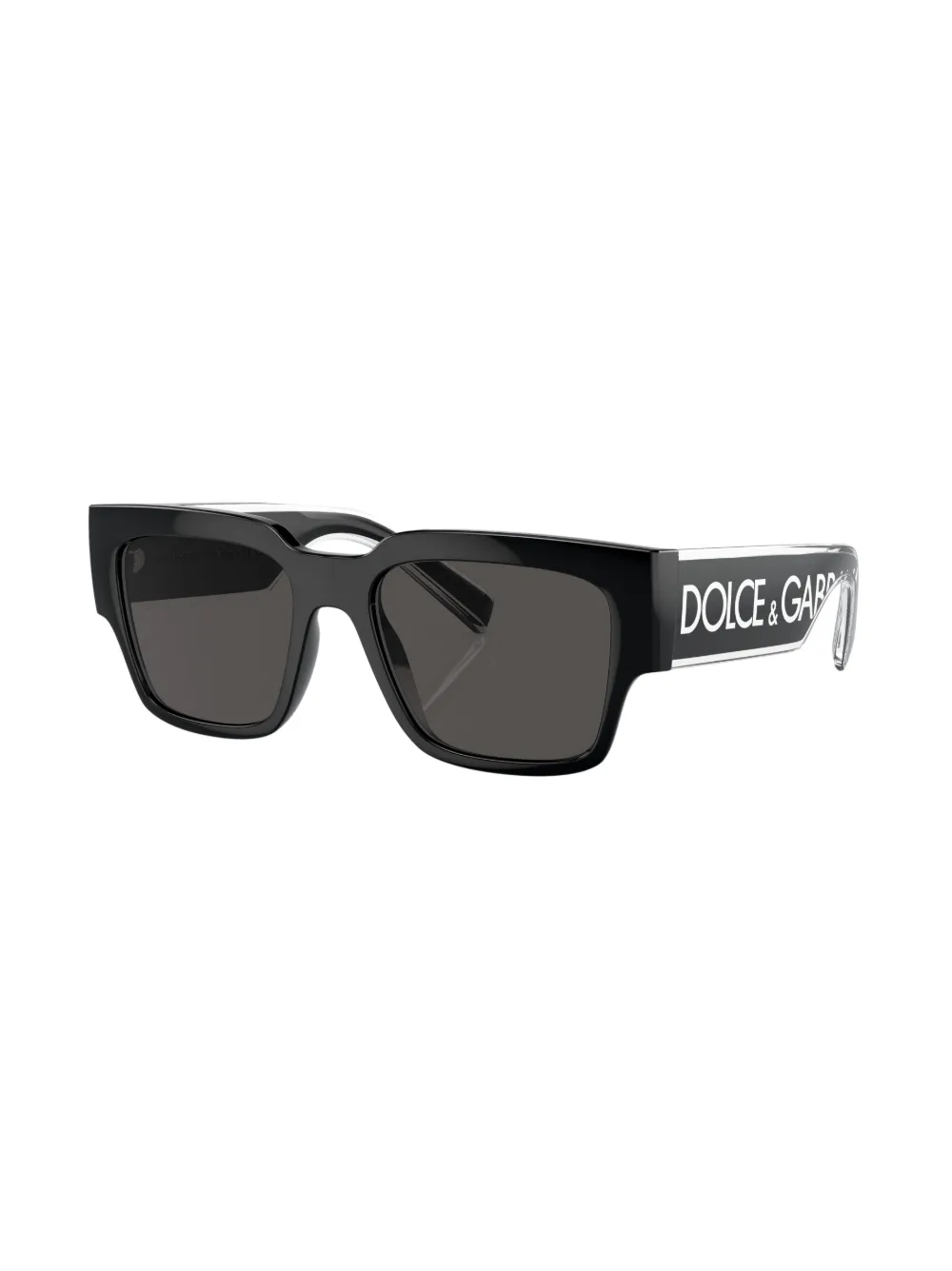 Zwart, grijze glazen, vierkant montuur, logoprint op het pootje, oversized pootjes en gebogen uiteinde. Deze bril wordt verkocht met een beschermhoes..