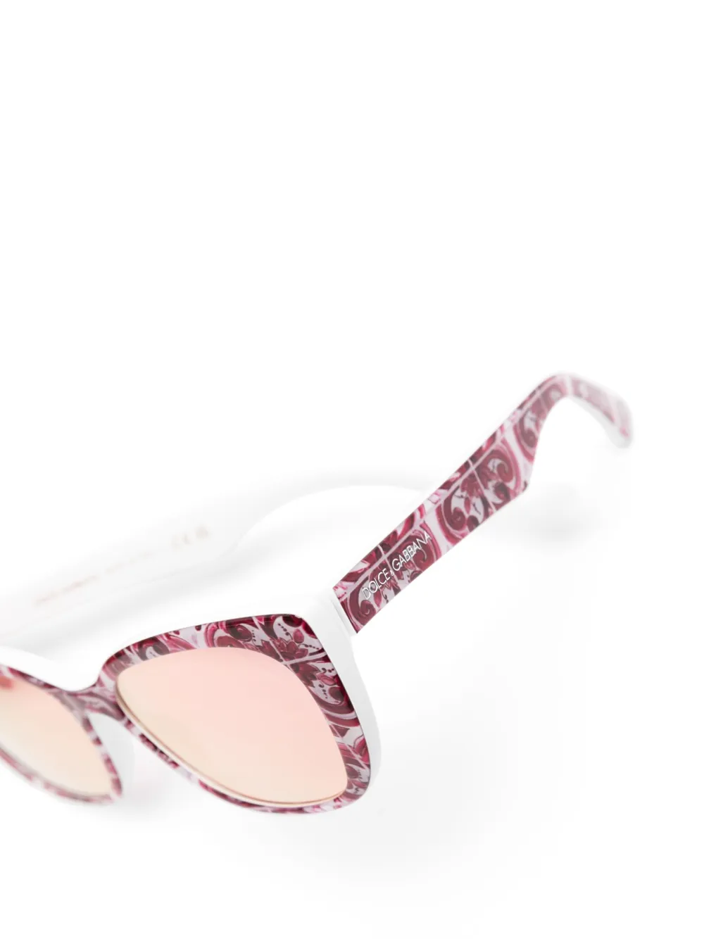 Wit, roze, acetaat, Majolica print, vlindermontuur, gespiegelde glazen, pootje met gegraveerd logo, geschulpte pootjes en gebogen uiteinde. Deze bril wordt verkocht met een beschermhoes..