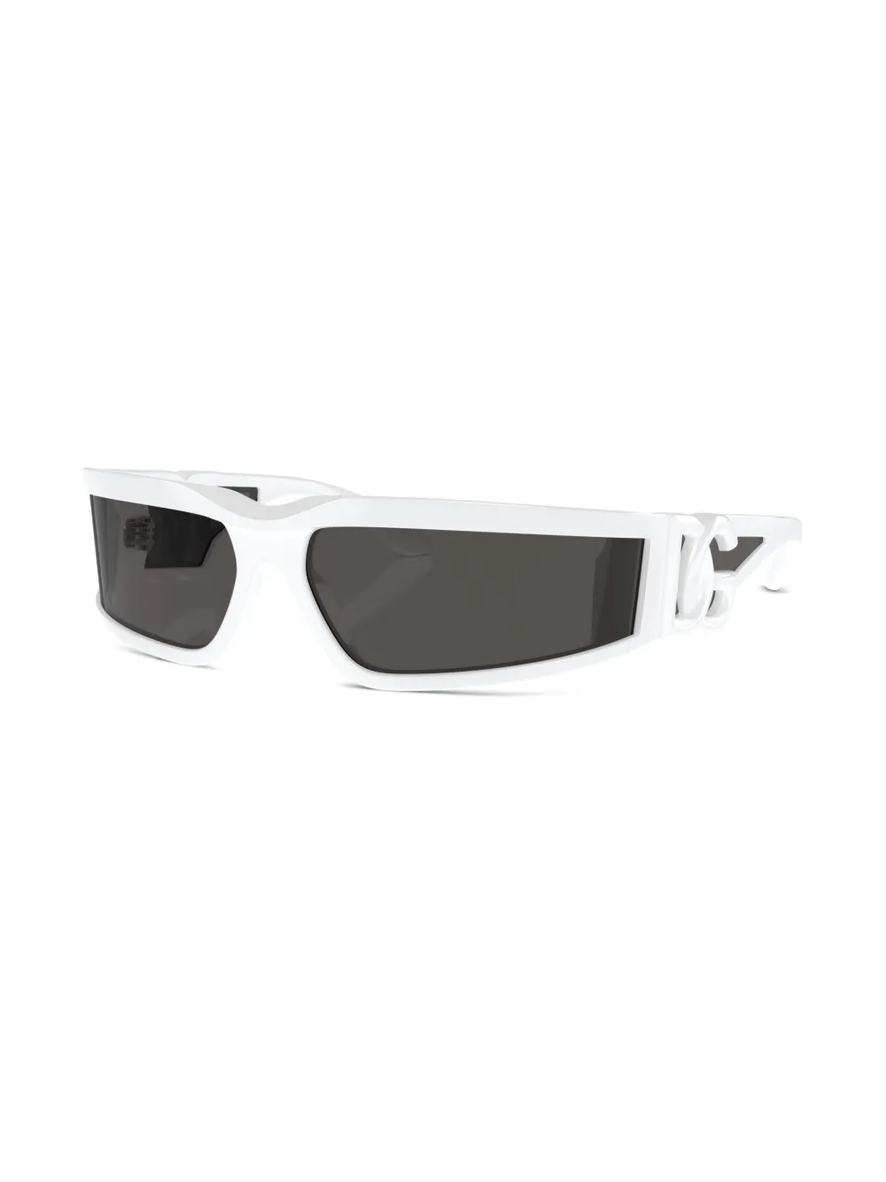 krijtwit glanzende afwerking wrap-around montuur grijze glazen glazen met UV-bescherming logoplakkaat op het pootje gewelfde pootjes rechte afwerking Deze bril wordt verkocht met een beschermhoes.