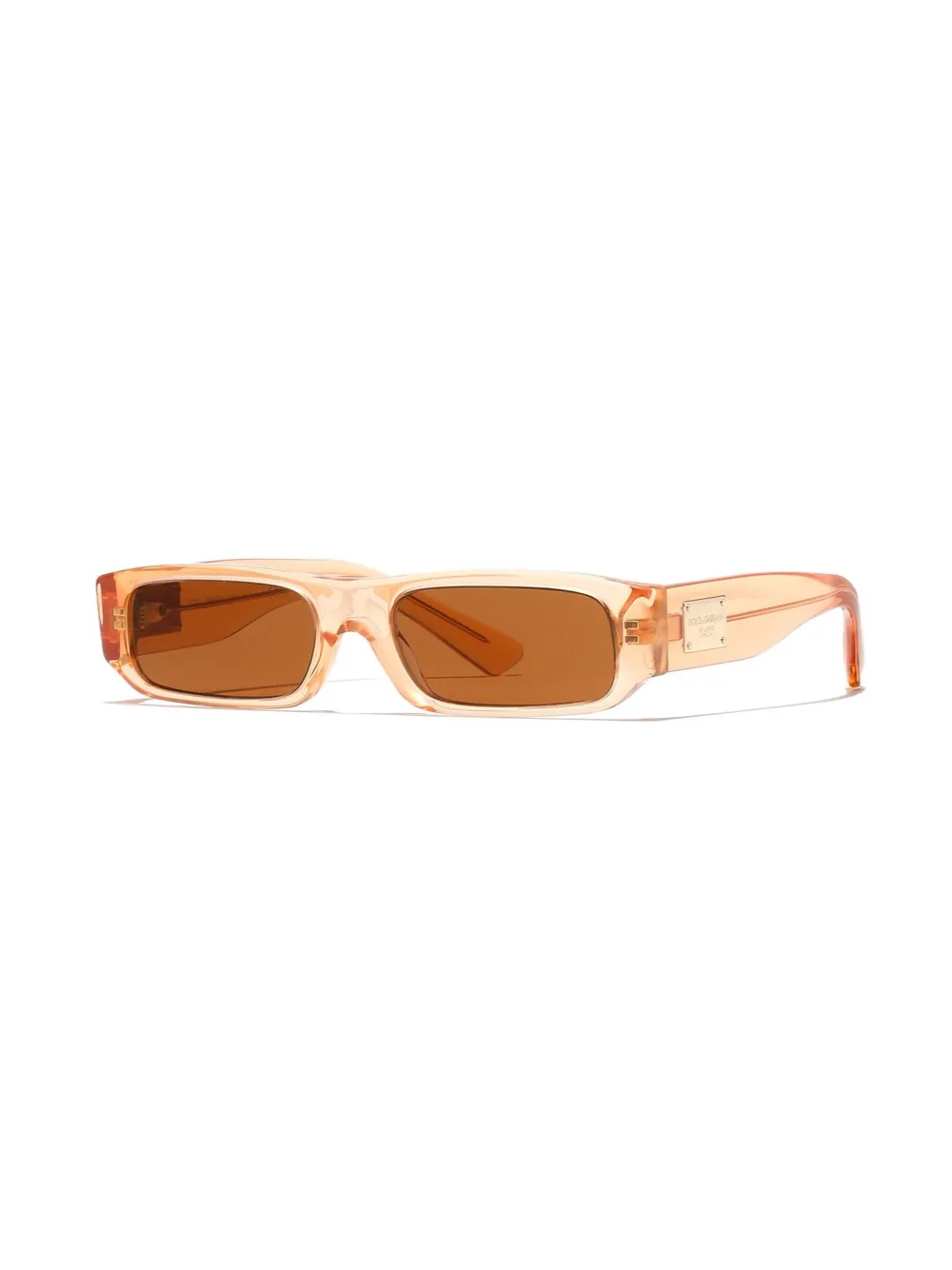 perzikoranje acetaat doorzichtig design rechthoekig montuur bruine glazen logo plakkaat rechte pootjes gebogen uiteinde Deze bril wordt verkocht met een beschermhoes.