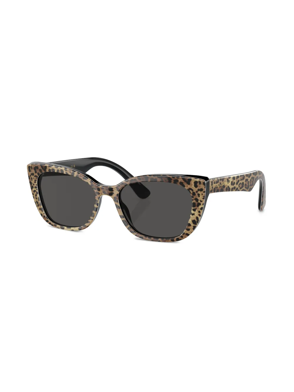 Lichtbruin, zwart, cheetah print, grijze glazen, cat-eye montuur, logoprint aan de zijkant, rechte pootjes en gebogen uiteinde. Deze bril wordt verkocht met een beschermhoes..