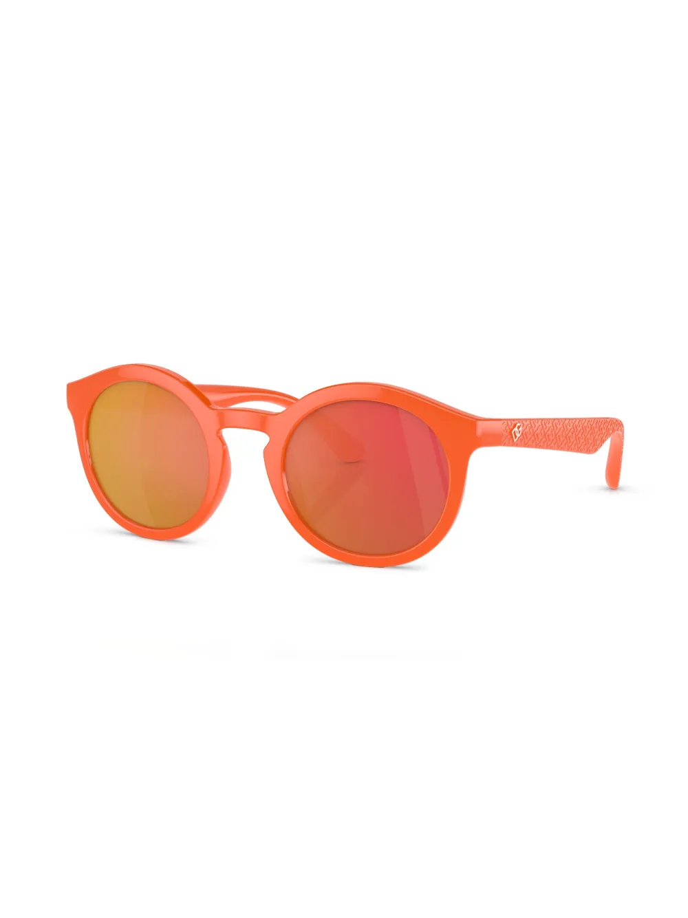Pompoenoranje, acetaat, gespiegelde glazen, rond montuur, logoprint op het pootje, logo bedrukt pootje, rechte pootjes en gebogen uiteinde. Deze bril wordt verkocht met een beschermhoes..