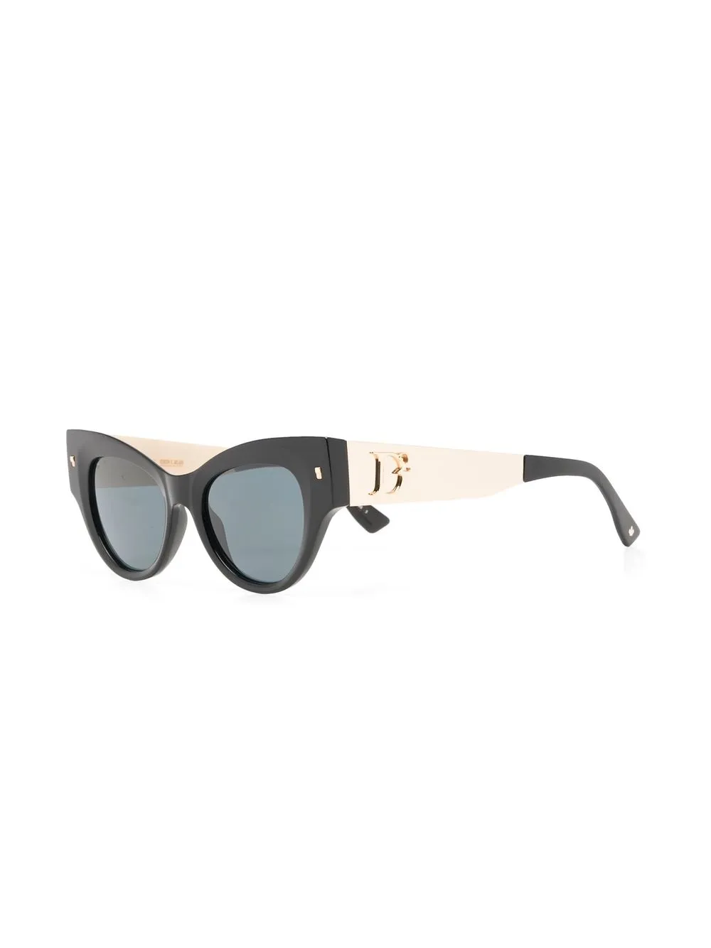 Zwart, gekleurde glazen, cat-eye montuur, verhoogde neusbrug, logoplakkaat op het pootje, rechte pootjes en gebogen uiteinde. Deze bril wordt verkocht met een beschermhoes..