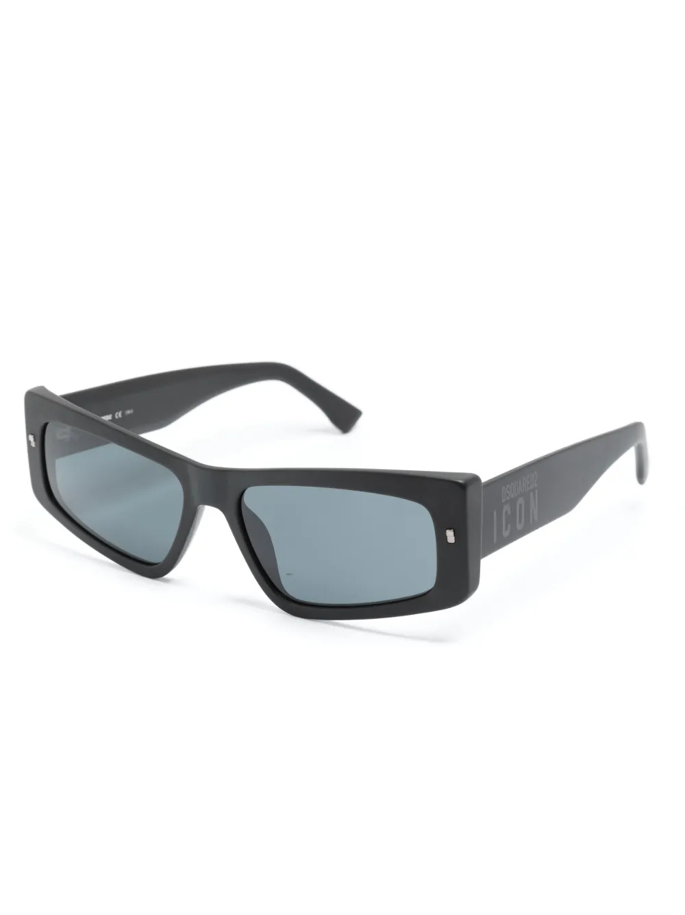 Zwart, acetaat, matte-effect, grijze glazen, rechthoekig montuur, breed design, logoprint aan de zijkant, gebogen uiteinde en zilverkleurig materiaal. Deze bril wordt verkocht met een beschermhoes..