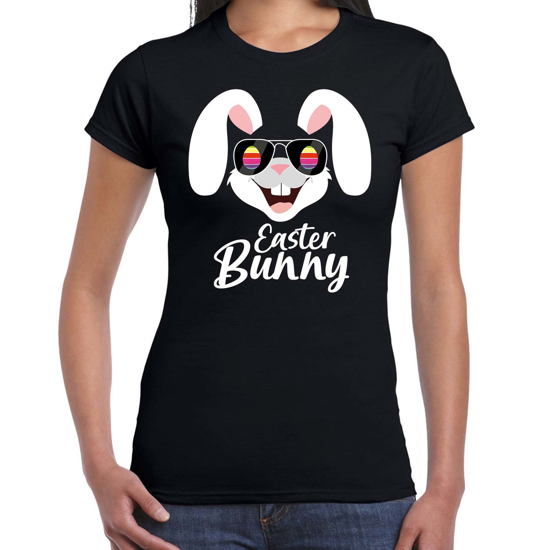 Easter bunny / Paashaas t-shirt zwart voor dames. Op dit zwarte shirt staat een vrolijke paashaas met een zonnebril en de tekst: Easter bunny. Leuk om aan te trekken met de Paasdagen / tijdens Pasen! materiaal: 100% katoen, 145 grams kwaliteit.