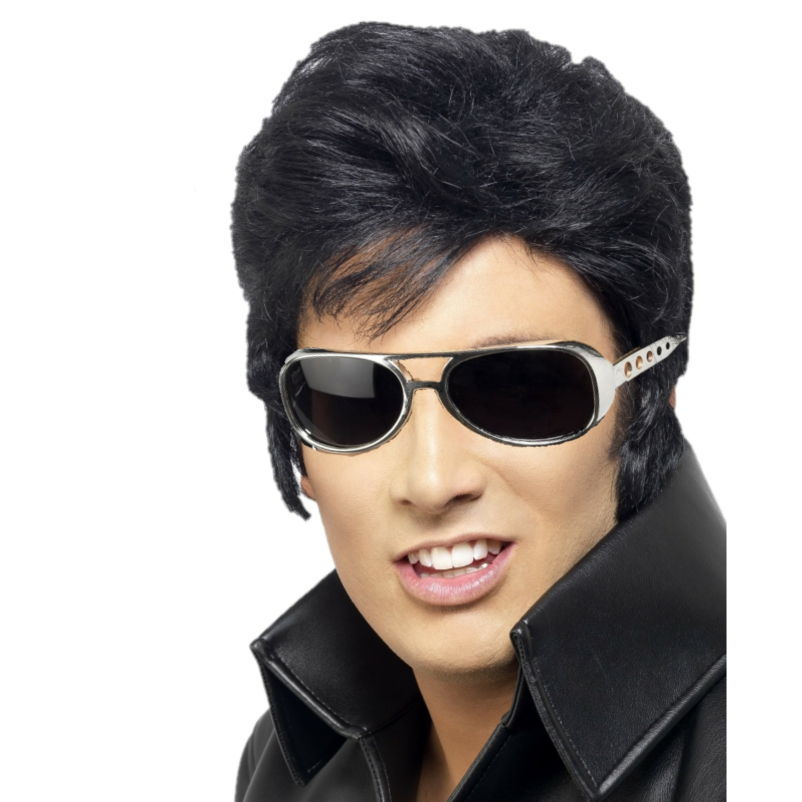 Elvis verkleed set pruik zwart en gouden bril voor heren. Rock and roll ster uit de jaren 60. Pruik is gemaakt van syntetisch materiaal. De bril is het echte Elvis bril model. Jaren 50/60 verkleedkleding thema. Let op: dit is een verkleedaccessoire voor volwassenen, geen speelgoed. , Dit artikel bestaat uit:, 1x Elvis zwarte pruik voor volwassenen – Carnaval verkleed pruiken – heren – popster, 1x Zilveren Elvis zonnebril