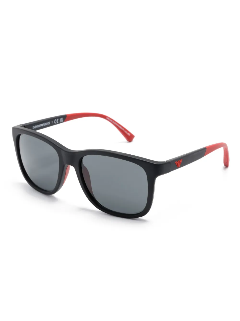 zwart/rood acetaat vierkant montuur blauwe glazen pootje met gegraveerd logogestrekte armen met gebogen uiteinden Deze bril wordt verkocht met een beschermhoes.