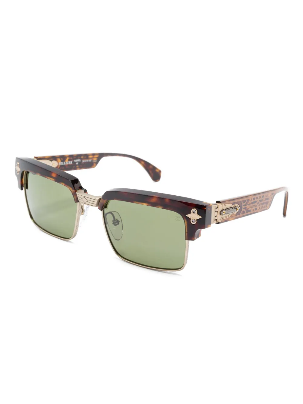 bruin geometrisch montuur goudkleurige details groene glazen gegraveerd detail op pootjes Deze bril wordt verkocht met een beschermhoes.