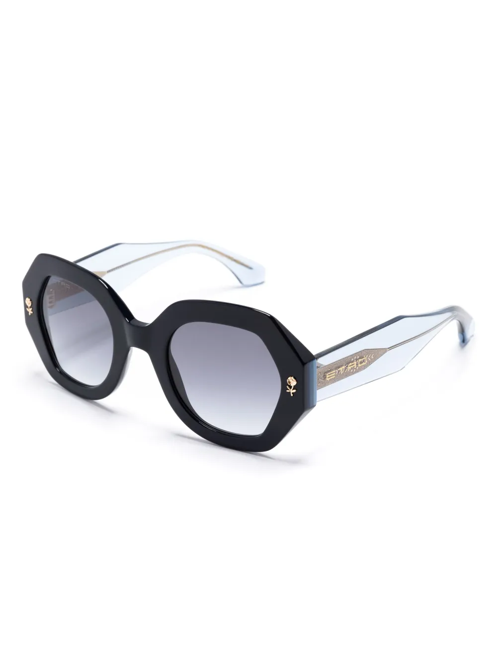 zwart/lichtblauw acetaat geometrisch montuur glazen met kleurverloop geschulpte pootjes logoprint op de brillenpoot gebogen uiteinden Deze bril wordt verkocht met een beschermhoes.