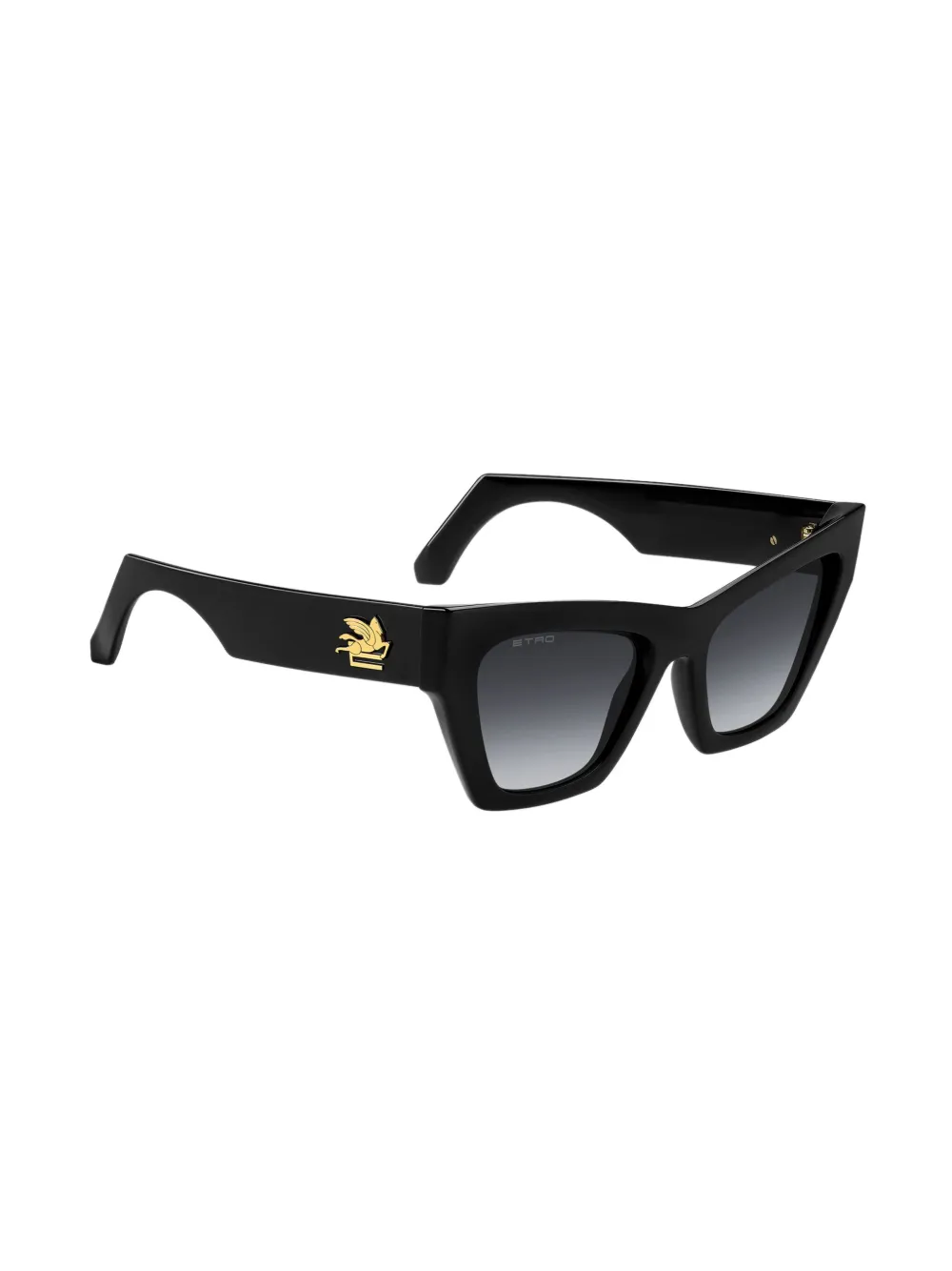 zwart acetaat vierkant montuur goudkleurig logoplakkaat gewelfde pootjes gekleurde glazen