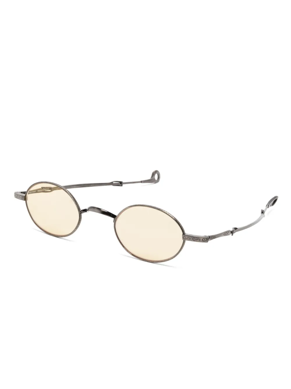 zilverkleurig metaal ovalen montuur gele glazen gewelfde pootjes rechte afwerking Deze bril wordt verkocht met een beschermhoes.