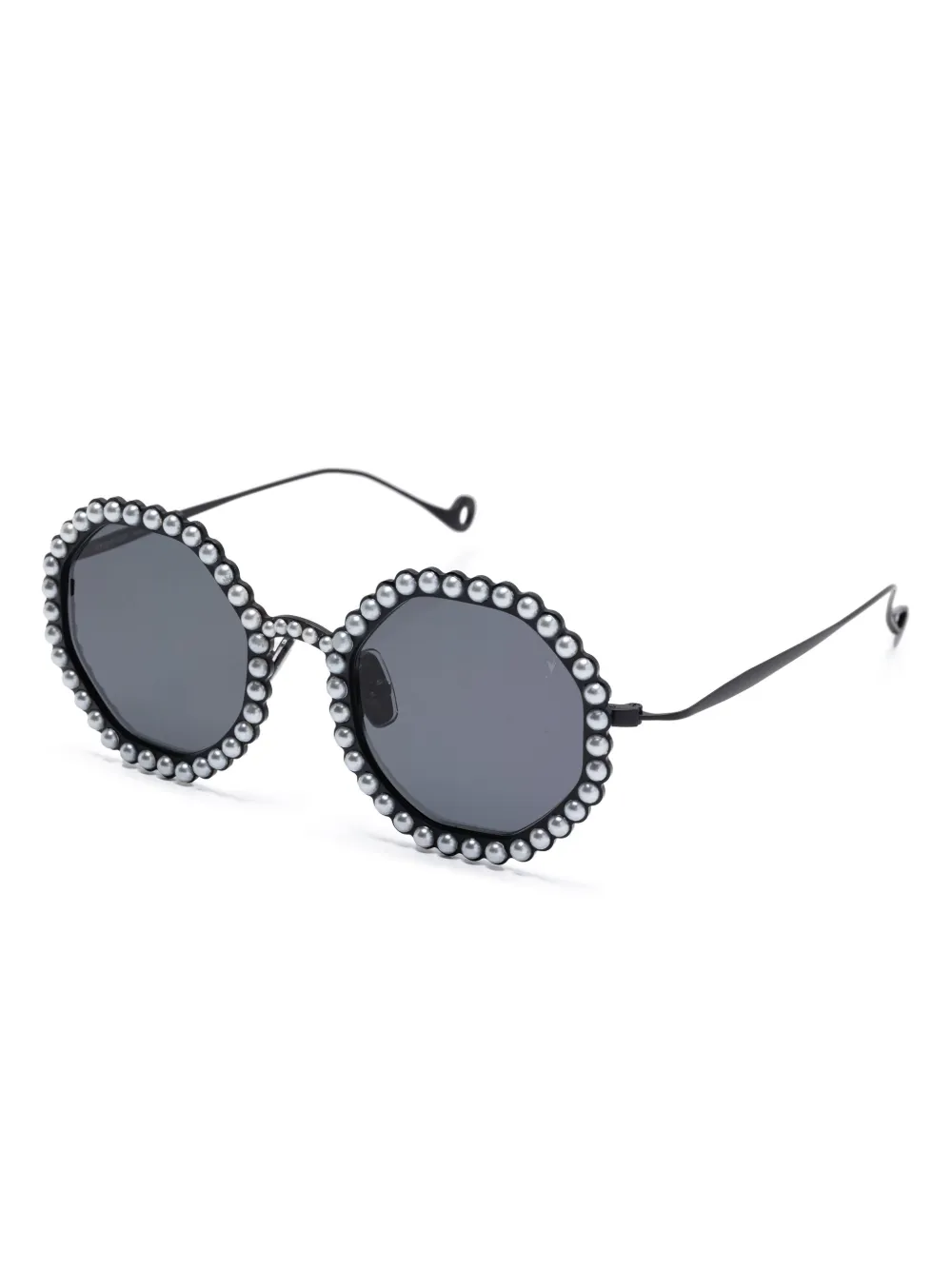 zwart rond montuur verfraaid met imitatieparels grijze glazen rechte pootjes gebogen uiteinden neuskussentjes Deze bril wordt verkocht met een beschermhoes.