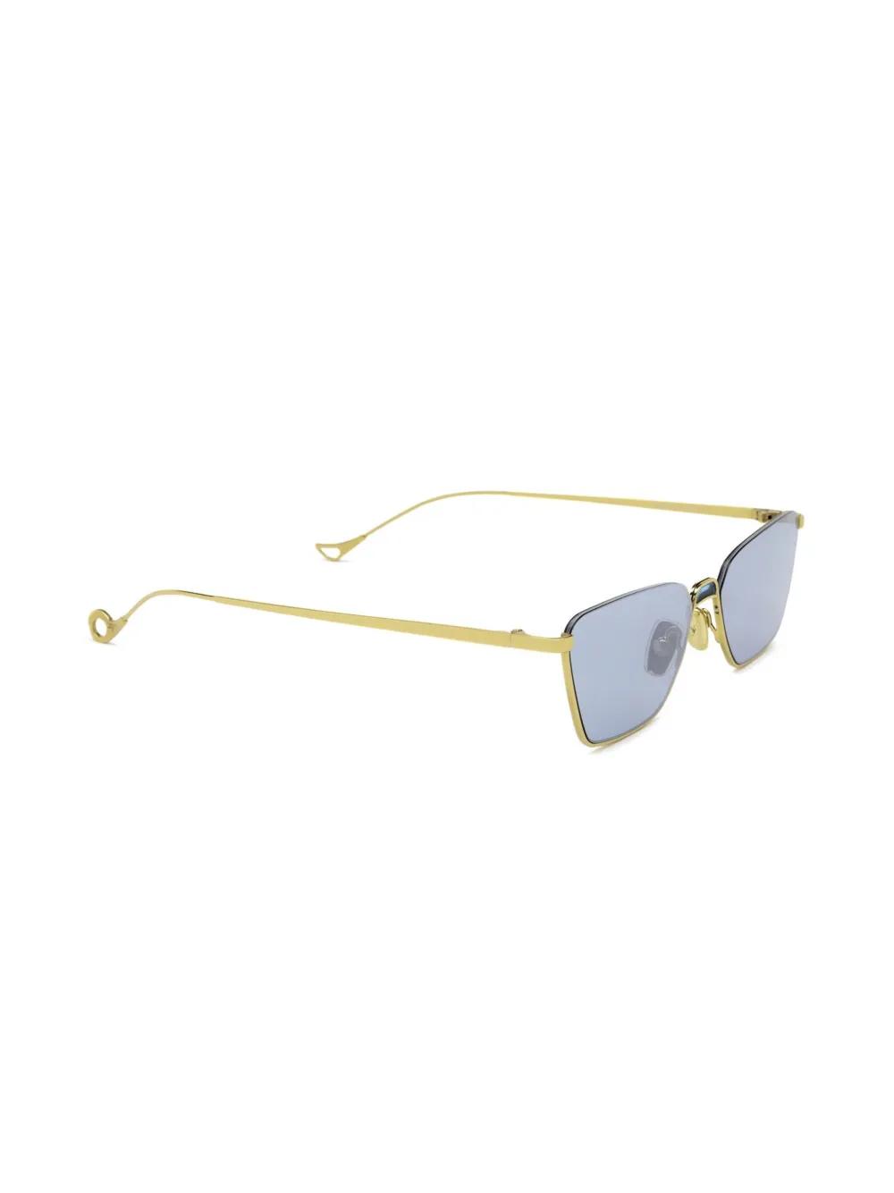 goudkleurig metaal rechthoekig montuur blauwe glazen glazen met UV-bescherming neuskussentjes rechte pootjes gebogen uiteinden Deze bril wordt verkocht met een beschermhoes.
