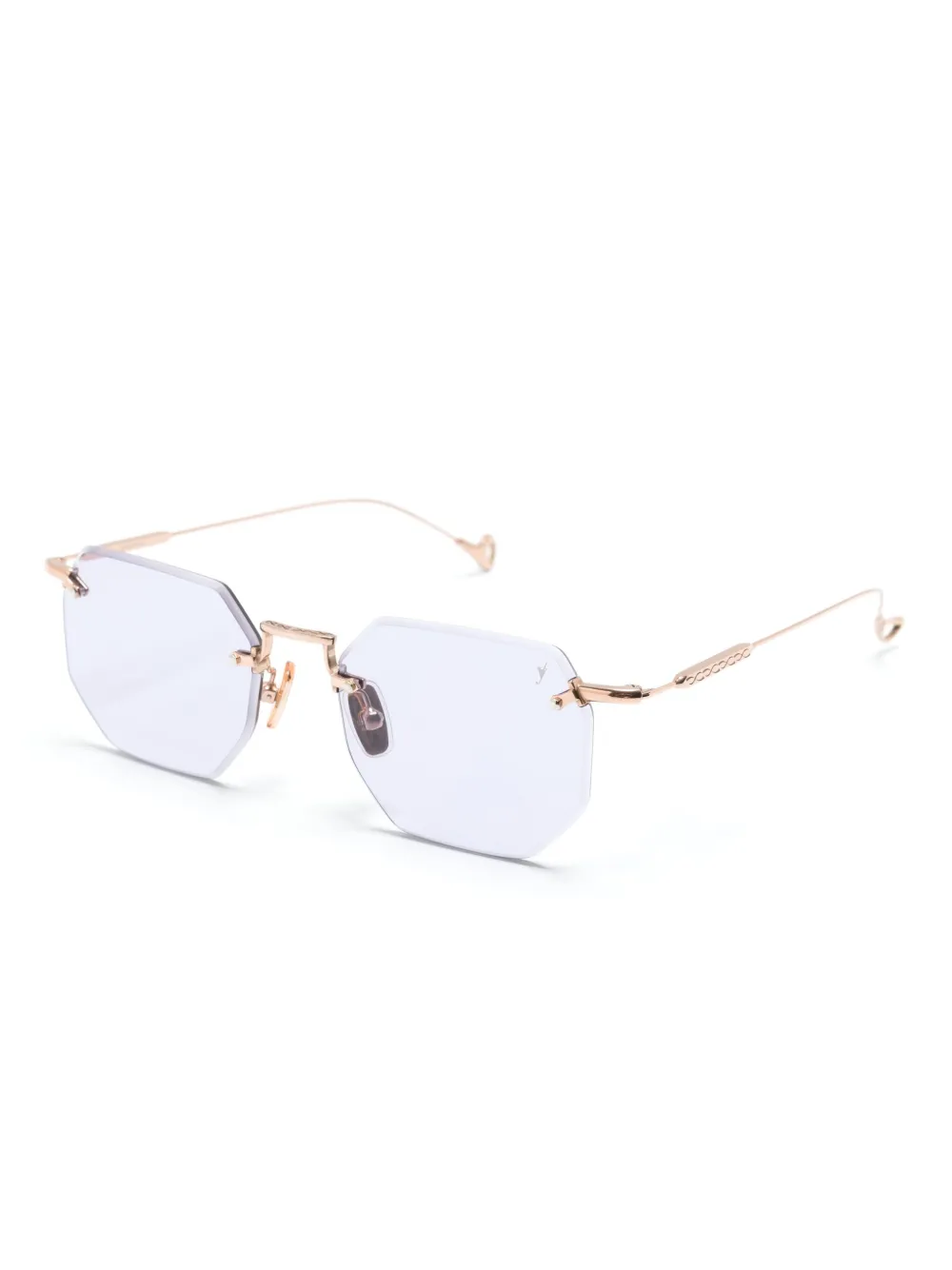 roze metaal randloze glazen geometrische vorm paarse glazen glazen met UV-bescherming pootje met gegraveerd logo geschulpte pootjes gebogen uiteinden Deze bril wordt verkocht met een beschermhoes.