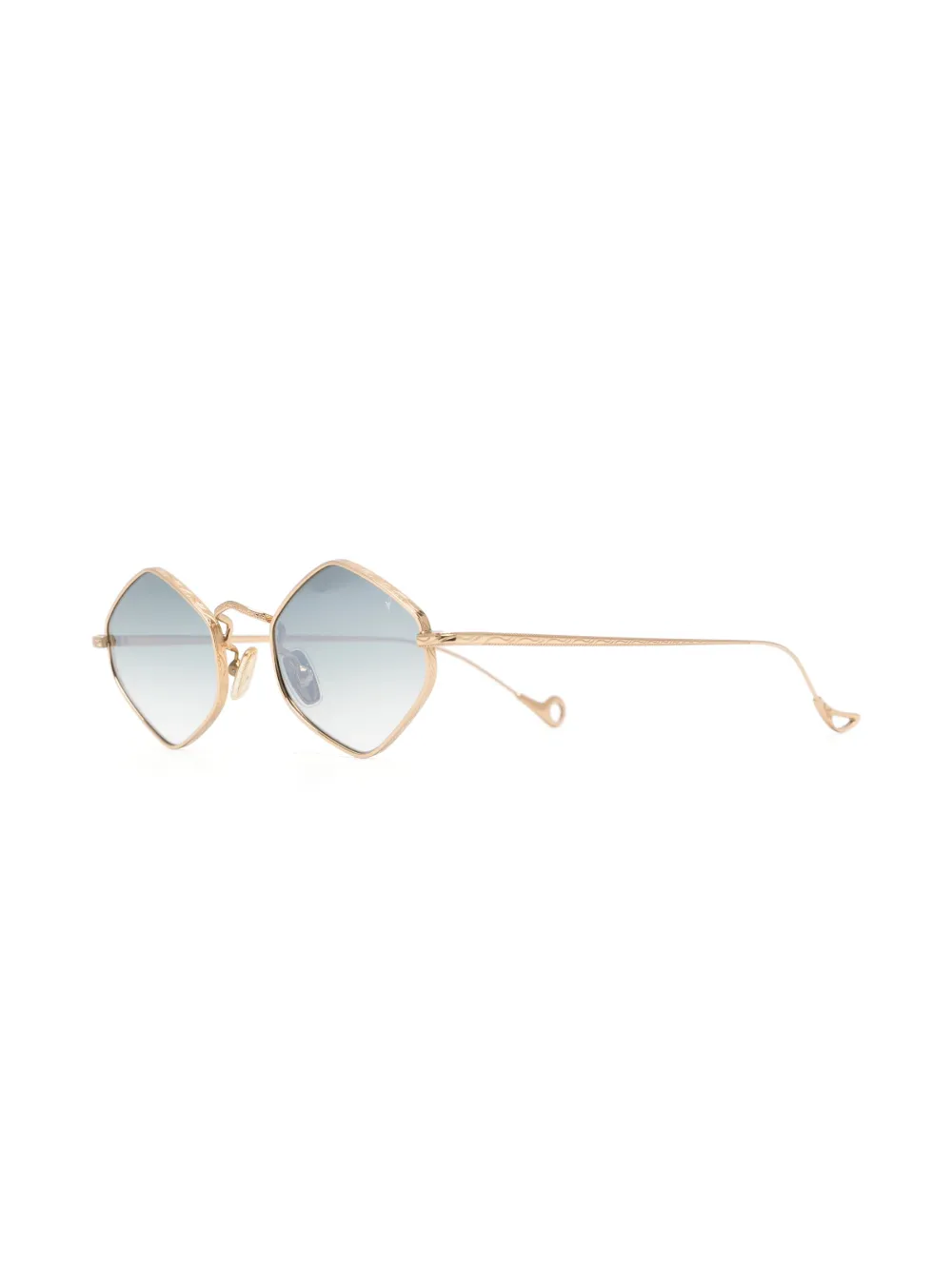 Messing, geometrisch montuur, blauwe glazen, goudkleurig materiaal, gegraveerd detail, neuskussentjes, rechte pootjes en gebogen uiteinde. Deze bril wordt verkocht met een beschermhoes..