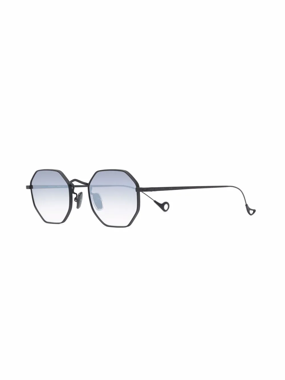 Geometrisch montuur, blauwe glazen, rechte pootjes en gebogen uiteinde. Materiaal: messing. Deze bril wordt verkocht met een beschermhoes..