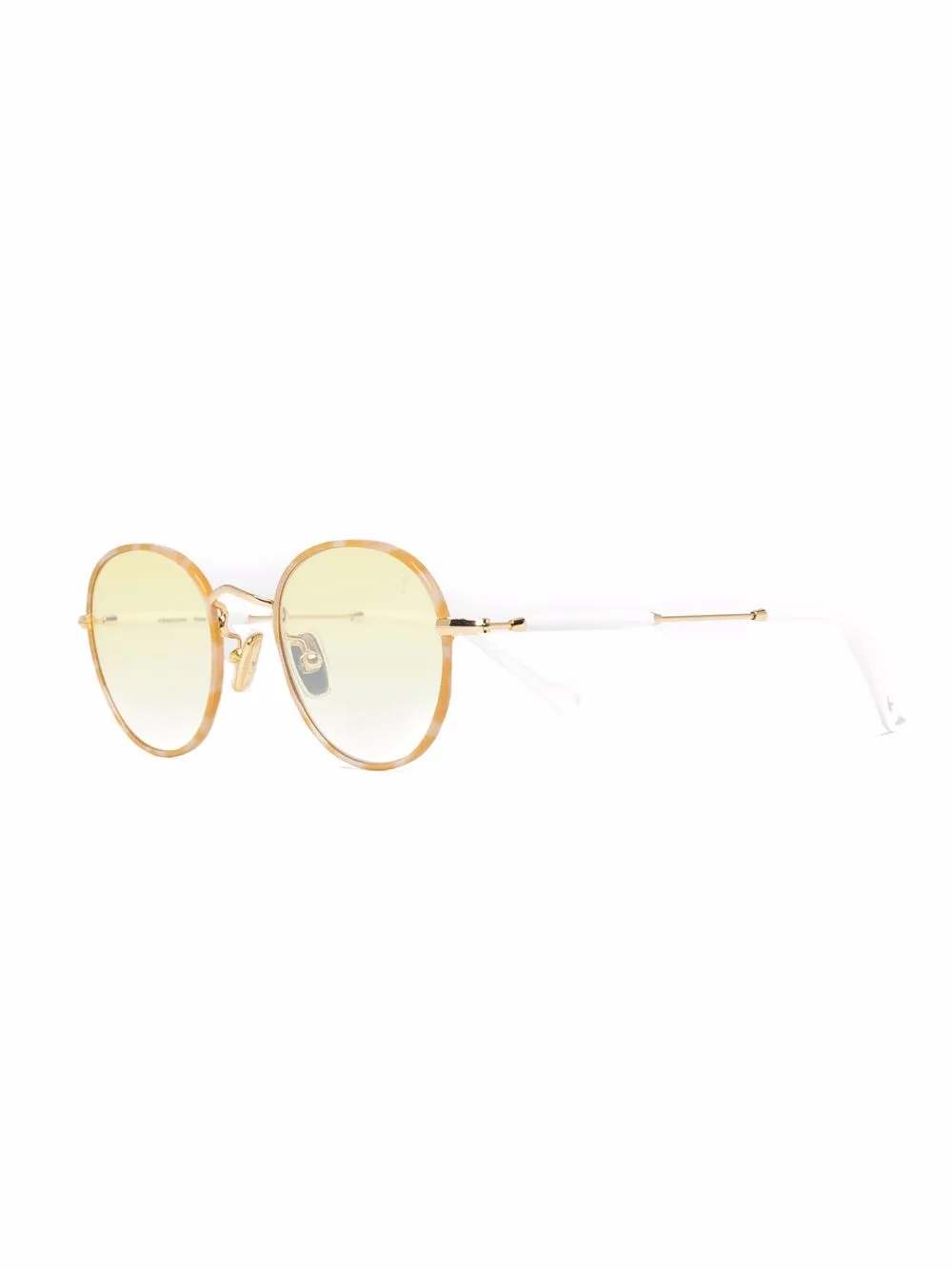 Rond montuur, gele glazen, rechte pootjes en gebogen uiteinde. Deze bril wordt verkocht met een beschermhoes..