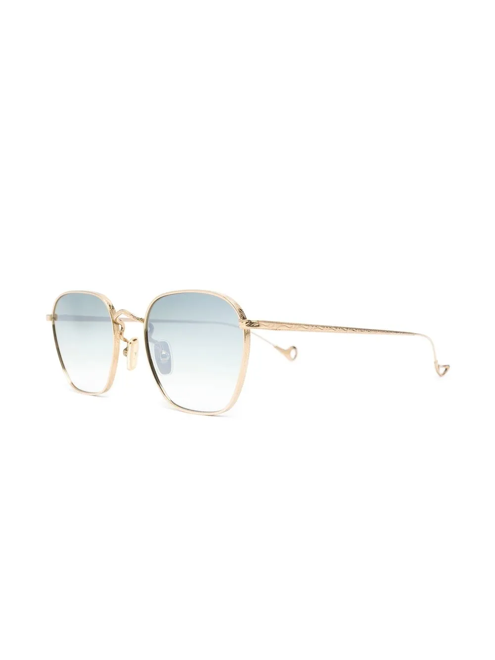 Goudkleurig, goudkleurig materiaal, vierkant montuur, glazen met kleurverloop, blauwe glazen, neuskussentjes, rechte pootjes, gebogen uiteinde en glazen met UV-bescherming. Deze bril wordt verkocht met een beschermhoes..