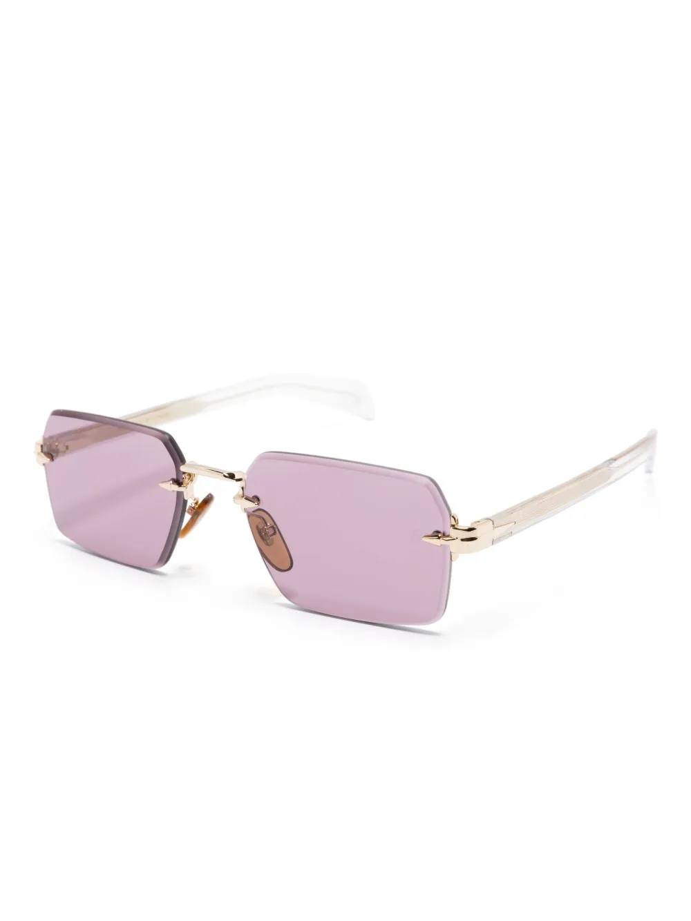 goudkleurig acetaat doorzichtig ontwerp geometrisch montuur randloze glazen paarse glazen neuskussentjes rechte pootjes gebogen uiteinden Deze bril wordt verkocht met een beschermhoes.