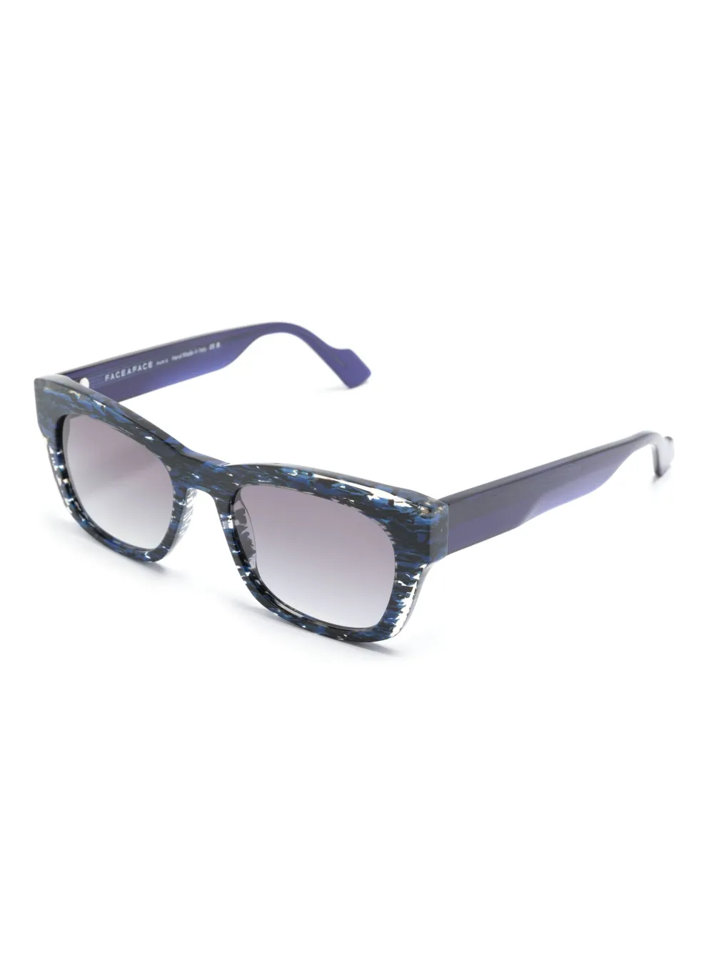 Indigo, acetaat, schildpad montuur, vierkant montuur, glazen met kleurverloop, rechte pootjes en gebogen uiteinde. Deze bril wordt verkocht met een beschermhoes..