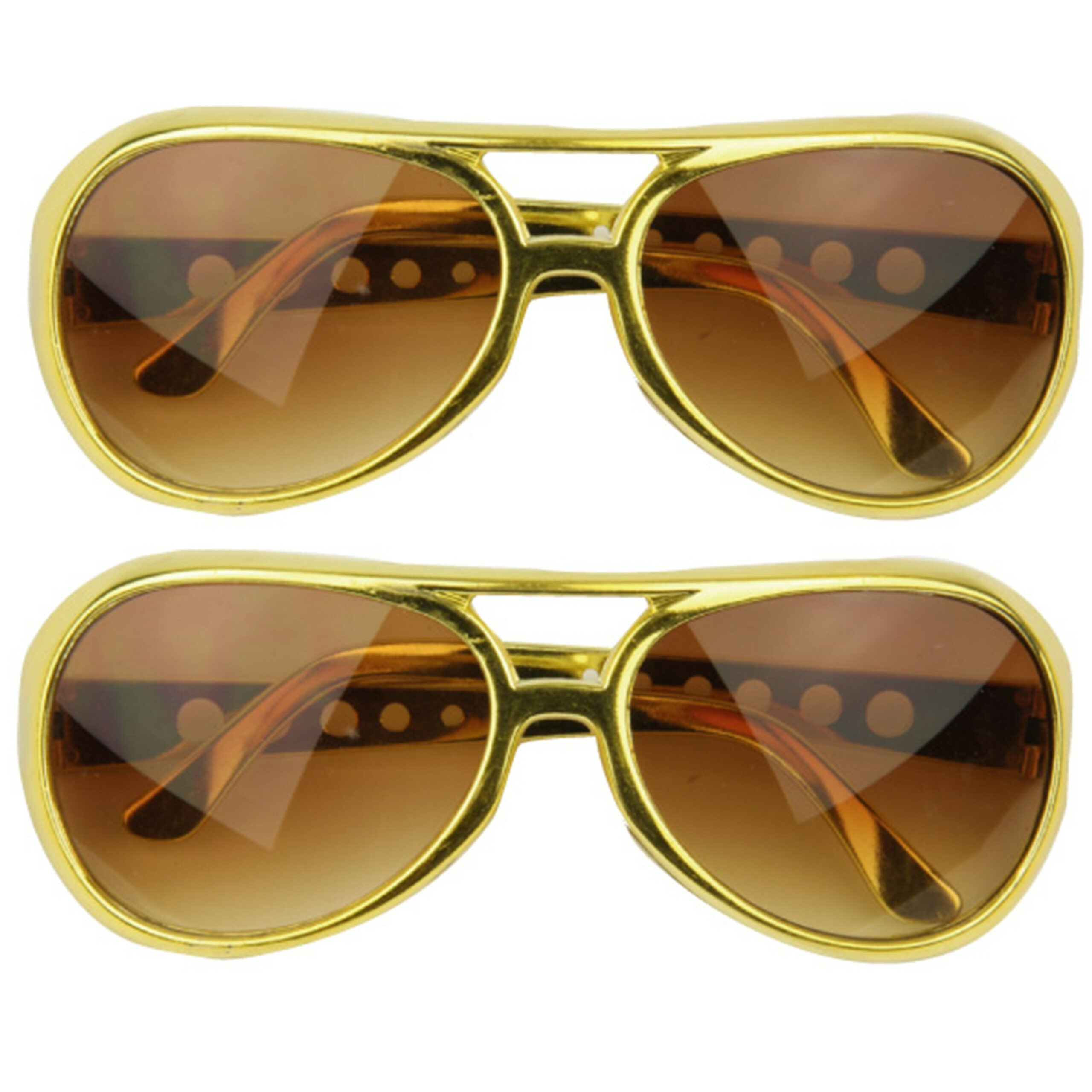Elvis model verkleed zonnebril goud. Materiaal: kunststof. Maak uw verkleedkleding set compleet met deze bijpassende party brillen.