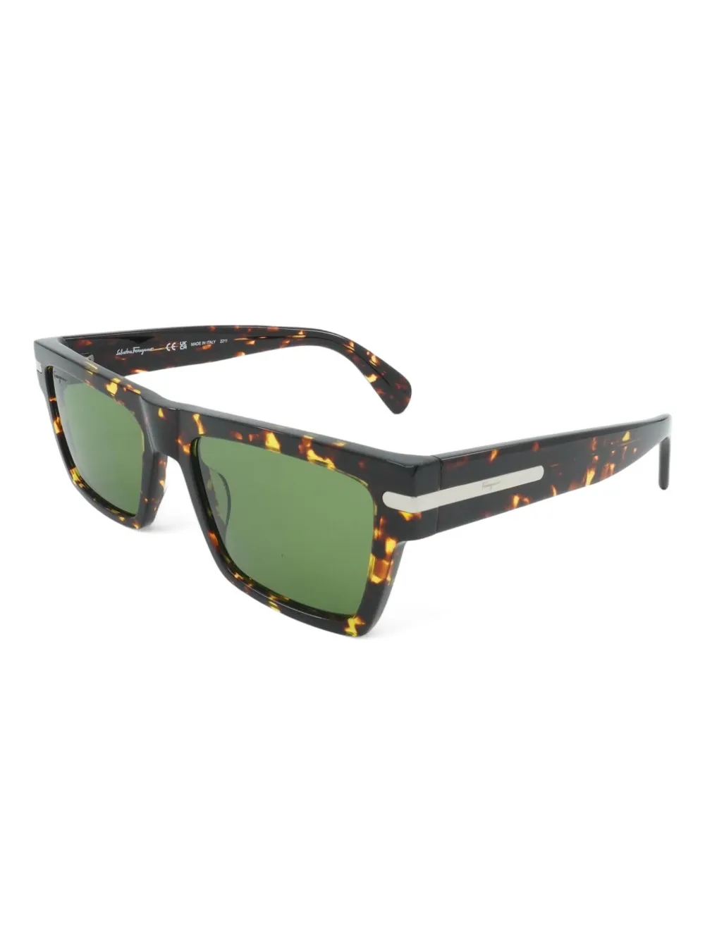 Havana bruin schildpad montuur rechthoekig montuur groen getinte glazen glazen met UV-bescherming rechte pootjes pootje met gegraveerd logo gebogen uiteinden Deze bril wordt verkocht met een beschermhoes.