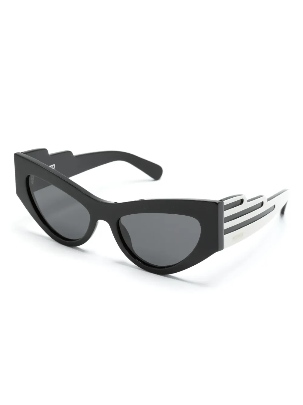 zwart acetaat cat-eye montuur grijze glazen vleugelpatroon geschulpte pootjes gebogen uiteinden Deze bril wordt verkocht met een beschermhoes.