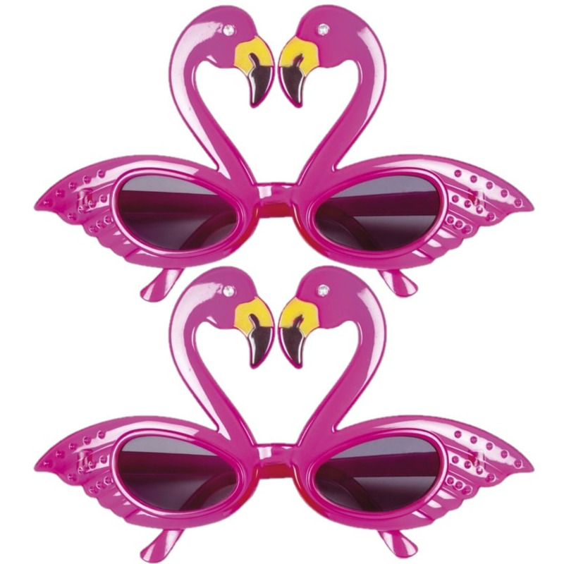 4 stuks flamingo Hawaii thema feest zonnebril voor volwassenen in het roze. Plastic zonnebril in de vorm van twee roze flamingos met strass-steentjes als oogjes. Leuk voor op een tropisch/Hawaii thema feest. Materiaal: kunststof. Geen UV-bescherming.