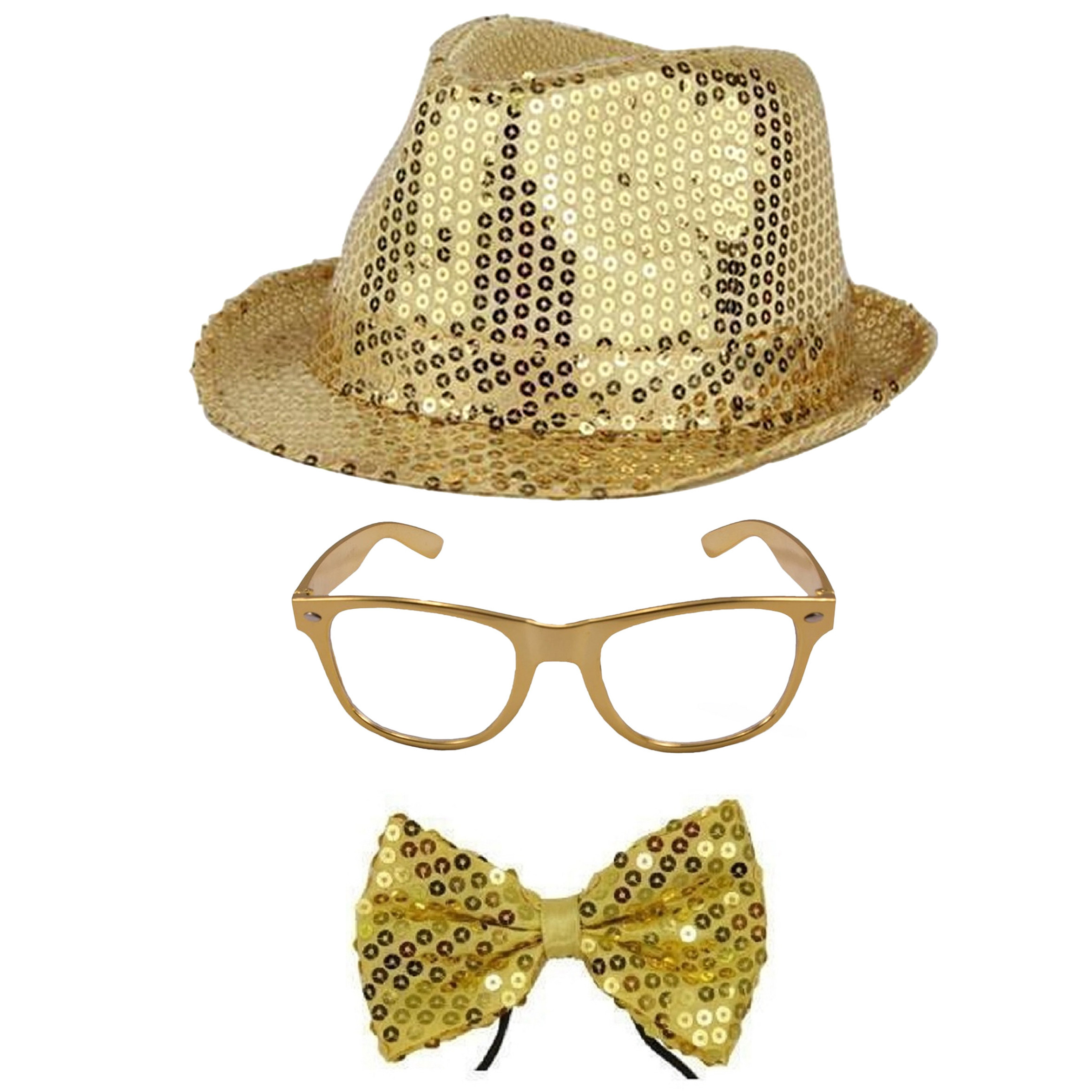 Carnaval verkleed setje met hoed, party zonnebril en strikje goud glitters. Het hoedje en strikje hebben pailletten. Voor volwassenen, dames en heren. Lekker opvallen met deze glitters thema verkleedset. Verkleedkleding kostuums accessoires. Themas: Disco, Eighties, Goud en fout, Toppers. Let op: dit is een verkleedaccessoire voor volwassenen, geen speelgoed. , Dit artikel bestaat uit:, 1x Carnaval verkleed vlinderstrikje met pailletten glitters – goud – volwassenen, 1x Folat Trilby hoedje – goud glitters – volwassenen – gleufhoedje – feesthoed – goud thema, 1x Verkleed bril – metallic goud – kunststof – verkleedaccessoires feestbril