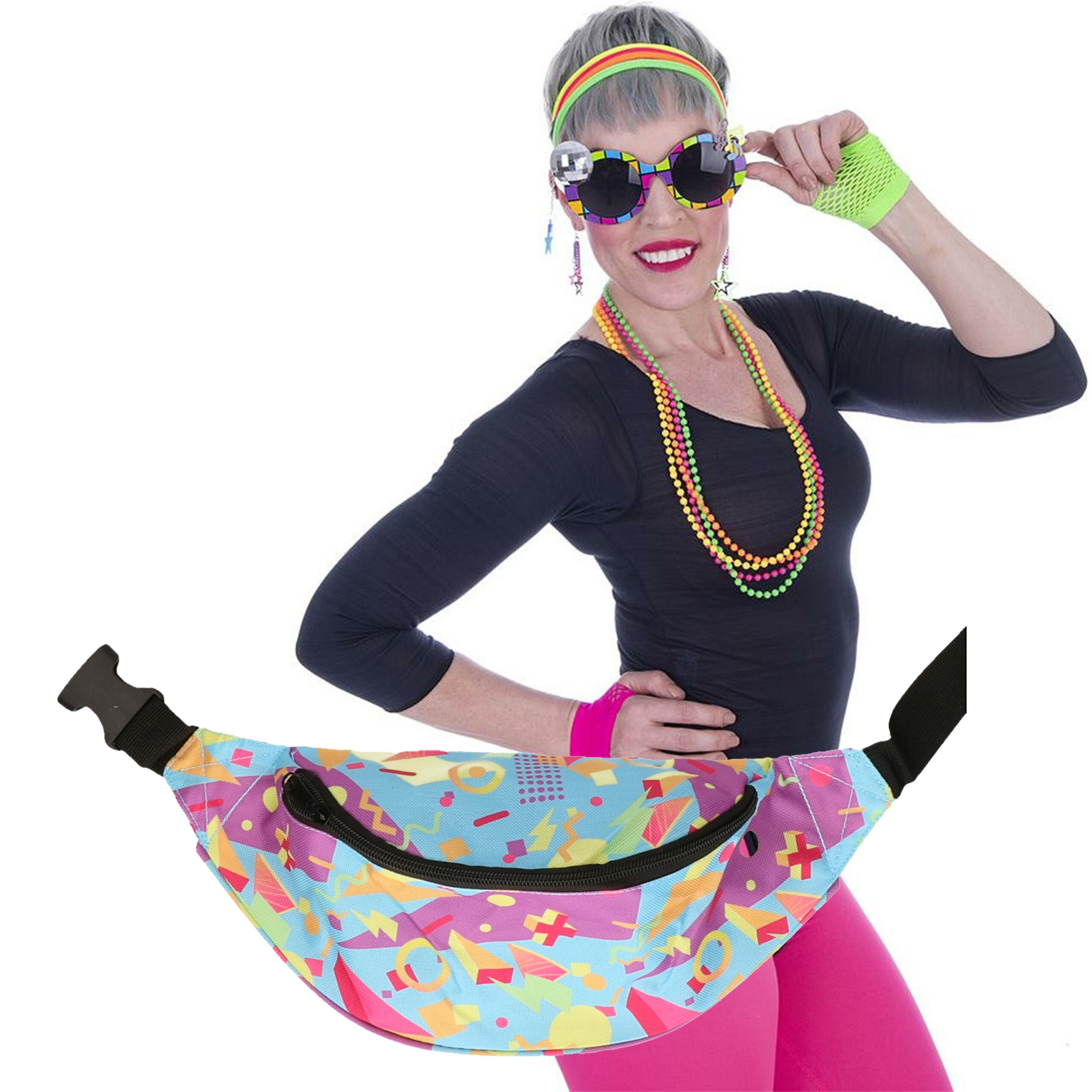 Complete foute 80s/90sparty verkleed accessoire/sieraden set voor dames. Maak de blits met dit kleurrijke setje tijdens je foute feestje of carnaval! Geschikt voor de themas: Eighties, jaren 80, Disco, Celeberties, Popsterren, Foute party. De set bestaat uit een heuptasje, zonnebril, kettingen, oorbellen en haarbandjes. , Dit artikel bestaat uit:, 1x Foute 80s/90s print party heuptasje – blauw – jaren 80/90 verkleed accessoires – volwassenen, 1x Eighties/Jaren 80 verkleedset – ketting/bril/handschoenen/bandjes – voor dames