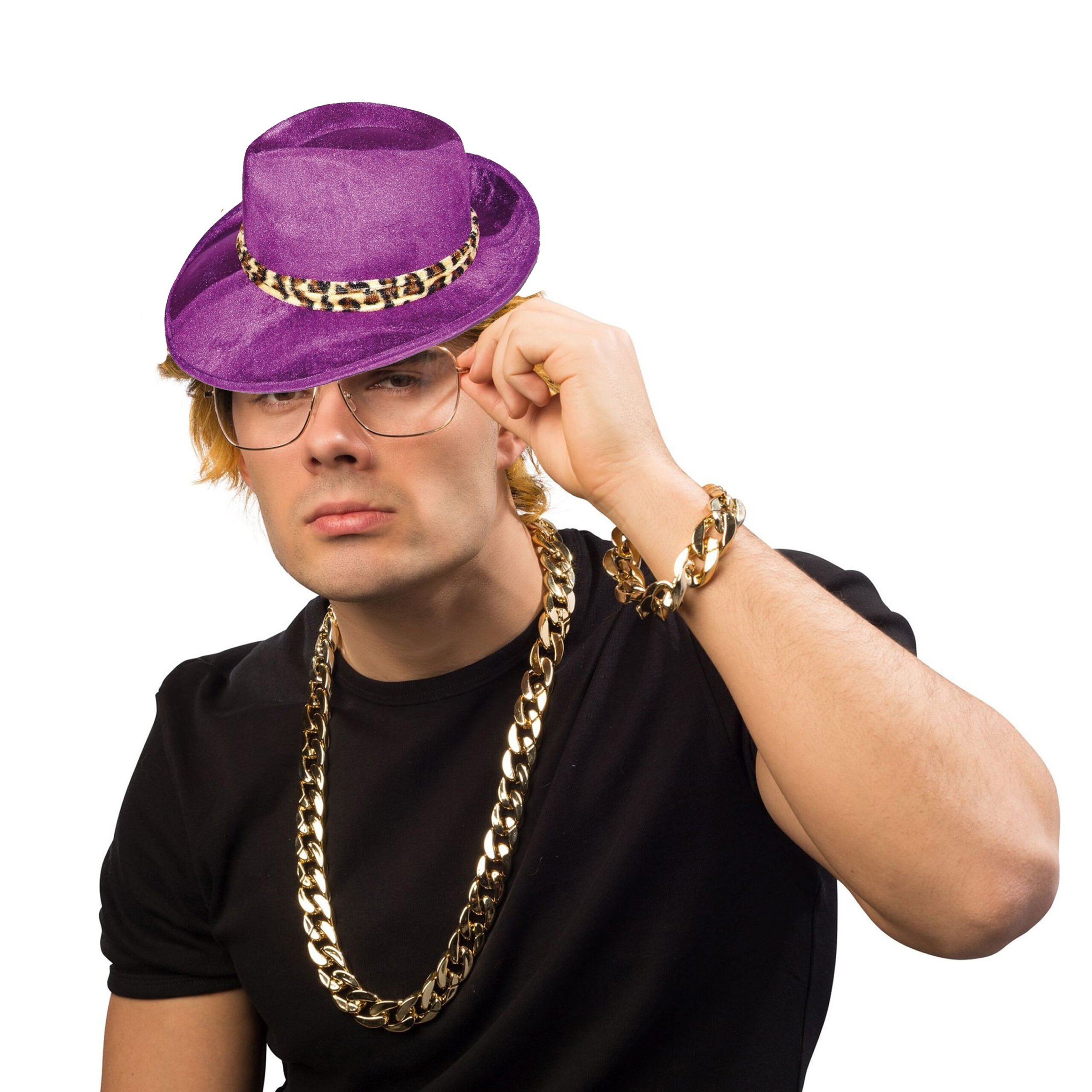 Foute party of Pimp/pooier verkleed spullen set voor heren. Een 3 delige accessoires set bestaande uit een paarse pimp hoed en een gouden schakelketting en armband. Je kan verder je gewone zwarte kleding zoals overhemd en pantalon gebruiken, maar leuker is een bijpassend verkleedkleding kostuum of verkleed thema t-shirt. Deze kunt u ook in onze winkel vinden. , Dit artikel bestaat uit:, 1x Carnaval Paarse Pimp hoed volwassenen – Pooier verkleed accessoires, 1x Carnaval verkleed set pooier/pimp/gangster – ketting en armband – volwassenen
