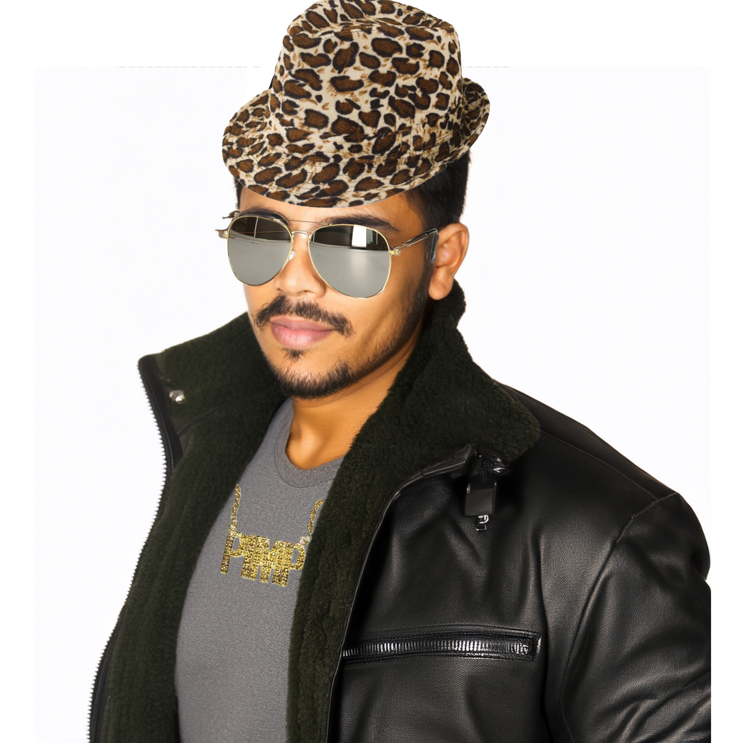 Foute party of Pimp/Pooier verkleed spullen set voor heren. Een 3 delige accessoires set bestaande uit een panter print hoed, een zonnebril met spiegel glazen, en een gouden schakelketting met pimp tekst hanger. Je kan verder je gewone zwarte kleding zoals overhemd en pantalon gebruiken, maar leuker is een bijpassend verkleedkleding kostuum of verkleed thema t-shirt. Deze kunt u ook in onze shop vinden. , Dit artikel bestaat uit:, 1x Carnaval verkleed schakelketting Pimp thema – goud – metaal – sieraden – Pooier thema, 1x Carnaval verkleed bril – Piloten/Politie bril met spiegelglazen – volwassenen, 1x Verkleed hoedje Party Kojak hoed met panterprint – bruin mix – volwassenen – Carnaval/pimp