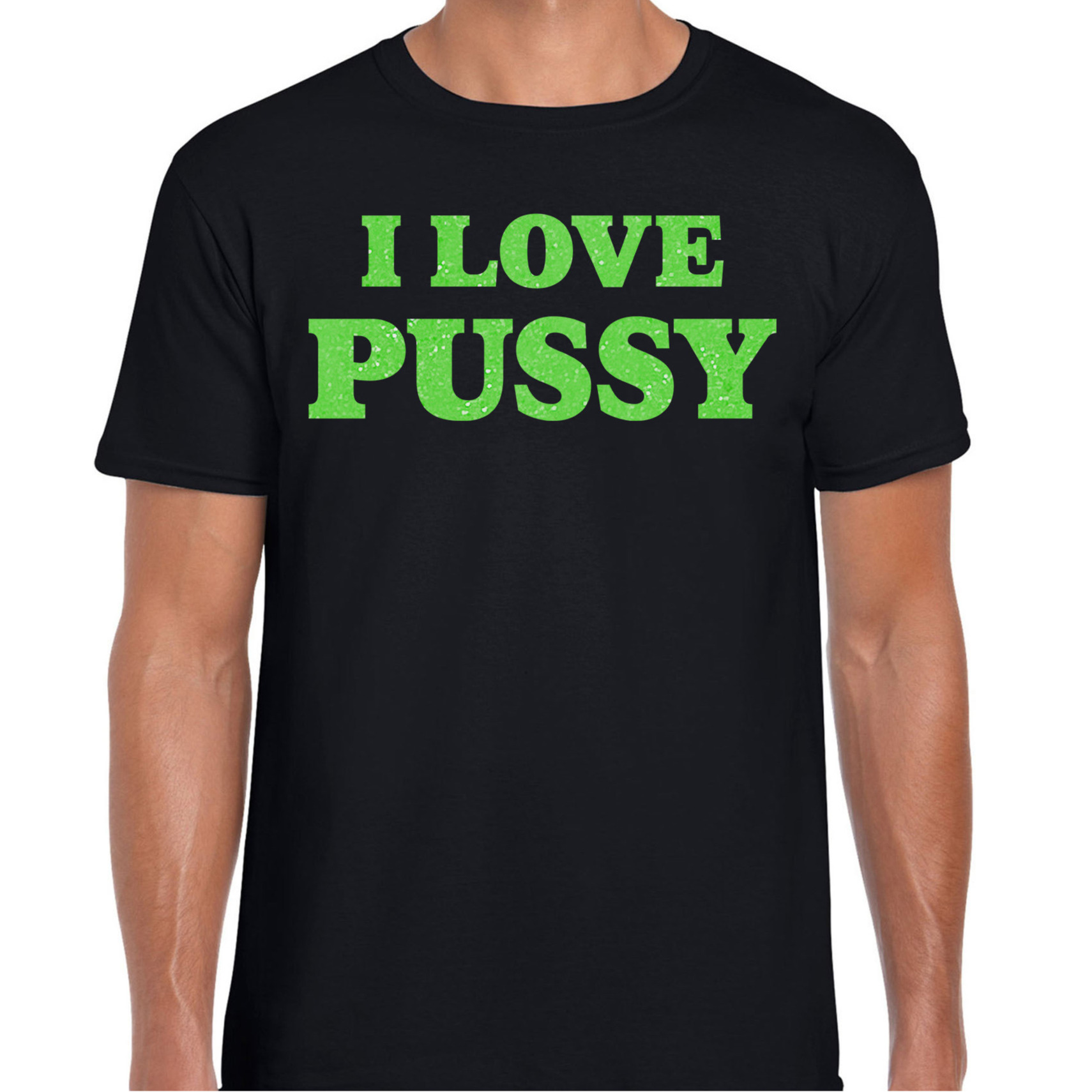 Foute party t-shirt voor heren in de kleur zwart met glitterbedrukking in de kleur groen. Dit gewaagde T-shirt is een absolute blikvanger voor foute party?s, carnaval of themafeesten! Met de brutale tekst “I Love Pussy” in glinsterend groen op een zwarte achtergrond maak je gegarandeerd indruk en zorg je voor de nodige lachsalvo’s. Het shirt is gemaakt van comfortabel materiaal, zodat je de hele avond kunt genieten van het feest. Met dit brutale T-shirt maak je van elk carnaval of themafeest een onvergetelijke en hilarische ervaring. Perfect voor de liefhebber van een foute party met een knipoog! Materiaal: 145 grams, 100% katoen. Merk: Bellatio Decorations.