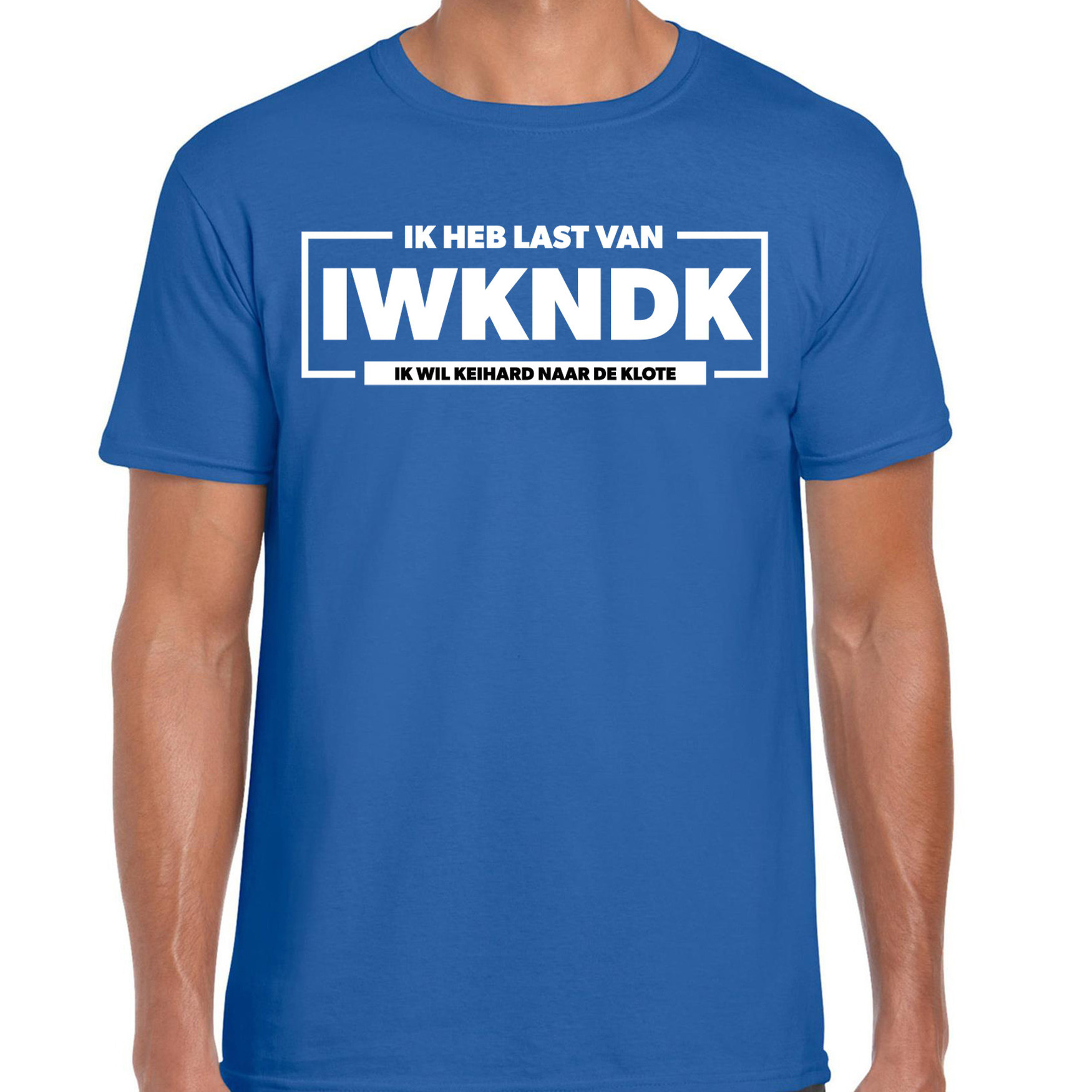 Foute party t-shirt voor heren in de kleur blauw. Het t-shirt is bedrukt met de tekst: Ik heb last van IWKNDK ik wil keihard naar de klote. Ga jij binnenkort naar een foute party, carnaval of themafeestje? Dan is dit grappige t-shirt onmisbaar! Tevens is hij ook leuk om zomaar te dragen of tijdens het uitgaan/stappen. Materiaal: 145 grams, 100% katoen. Merk: Bellatio Decorations.