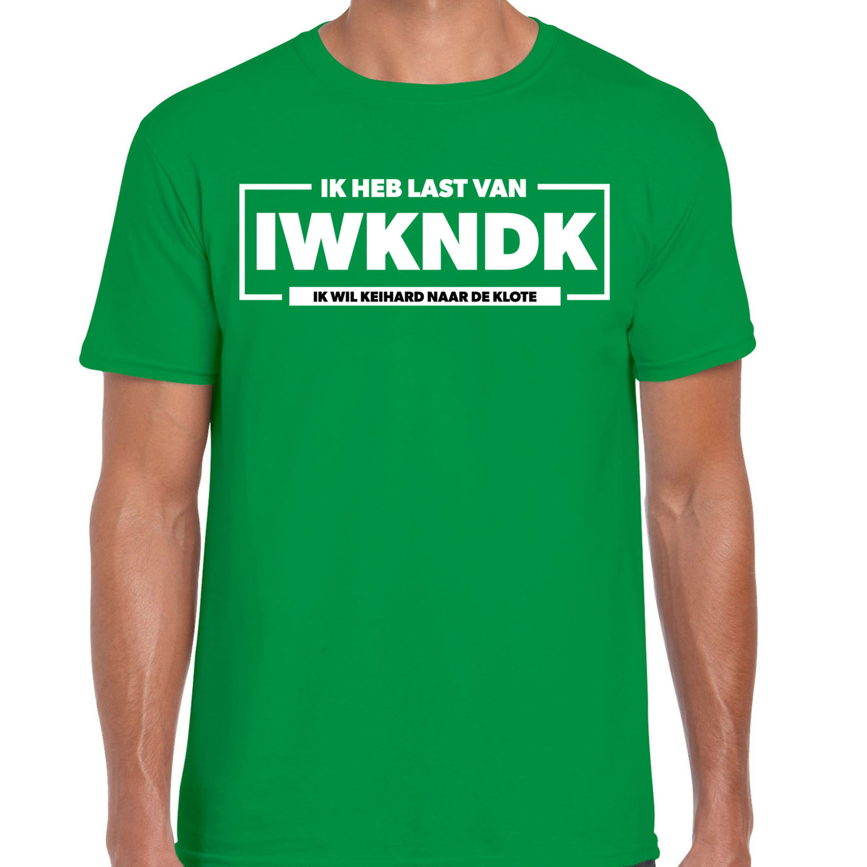 Foute party t-shirt voor heren in de kleur groen. Het t-shirt is bedrukt met de tekst: Ik heb last van IWKNDK ik wil keihard naar de klote. Ga jij binnenkort naar een foute party, carnaval of themafeestje? Dan is dit grappige t-shirt onmisbaar! Tevens is hij ook leuk om zomaar te dragen of tijdens het uitgaan/stappen. Materiaal: 145 grams, 100% katoen. Merk: Bellatio Decorations.