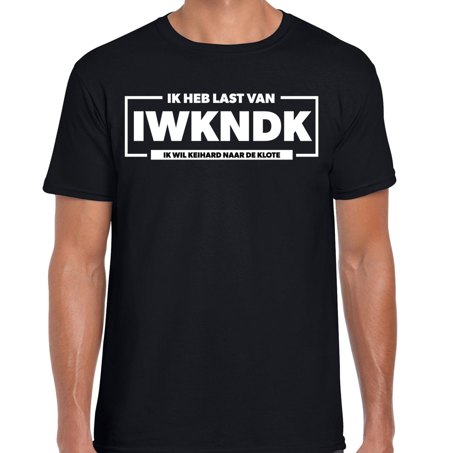 Foute party t-shirt voor heren in de kleur zwart. Het t-shirt is bedrukt met de tekst: Ik heb last van IWKNDK ik wil keihard naar de klote. Ga jij binnenkort naar een foute party, carnaval of themafeestje? Dan is dit grappige t-shirt onmisbaar! Tevens is hij ook leuk om zomaar te dragen of tijdens het uitgaan/stappen. Materiaal: 145 grams, 100% katoen. Merk: Bellatio Decorations.