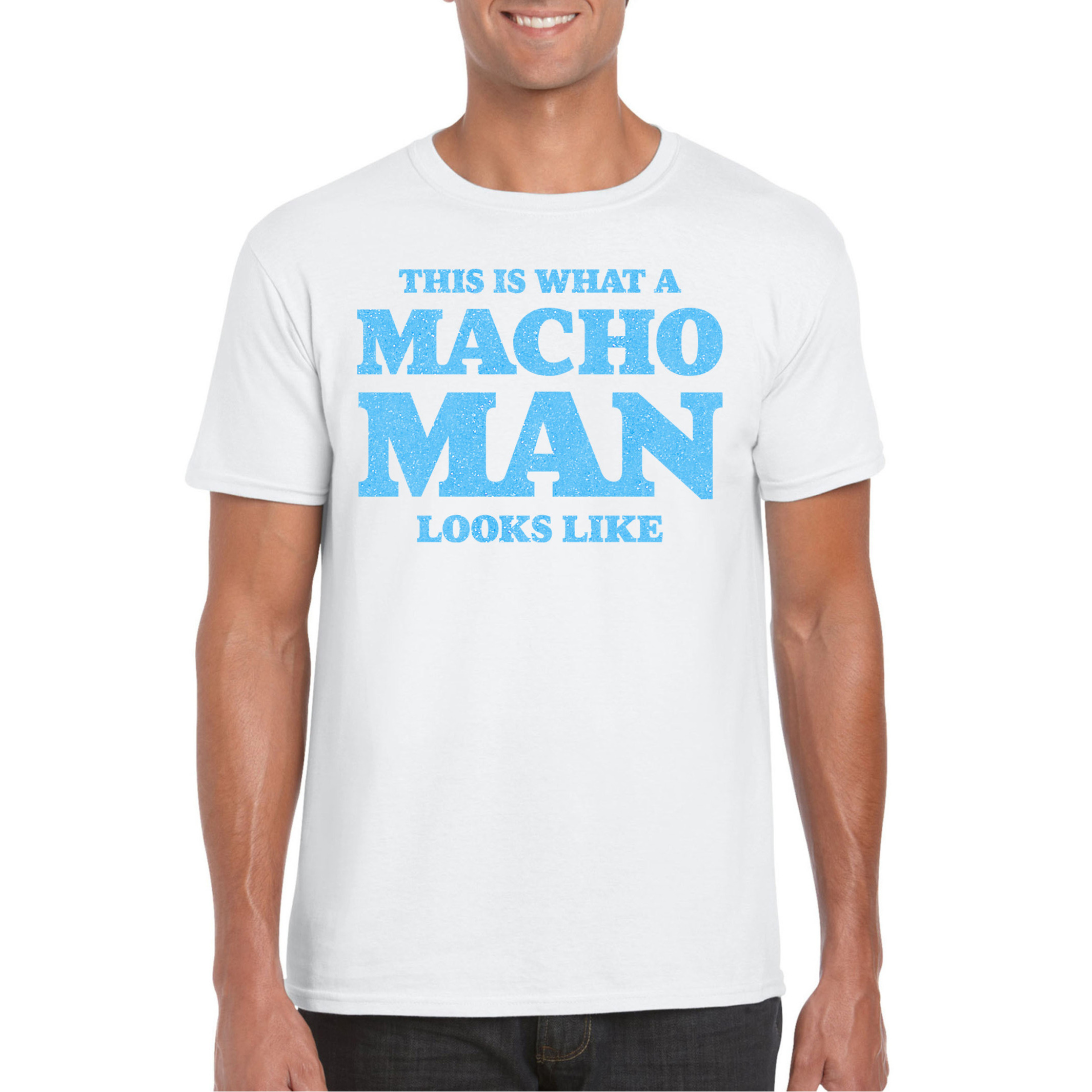 Foute party t-shirt voor heren in de kleur wit met glitterbedrukking in de kleur blauw. Het t-shirt is bedrukt met de tekst: This is What A Macho Man Looks Like. Ga jij binnenkort naar een foute party, carnaval of themafeestje? Dan is dit grappige t-shirt onmisbaar! Tevens is hij ook leuk om zomaar te dragen of tijdens het uitgaan/stappen. Materiaal: 145 grams, 100% katoen. Merk: Bellatio Decorations.