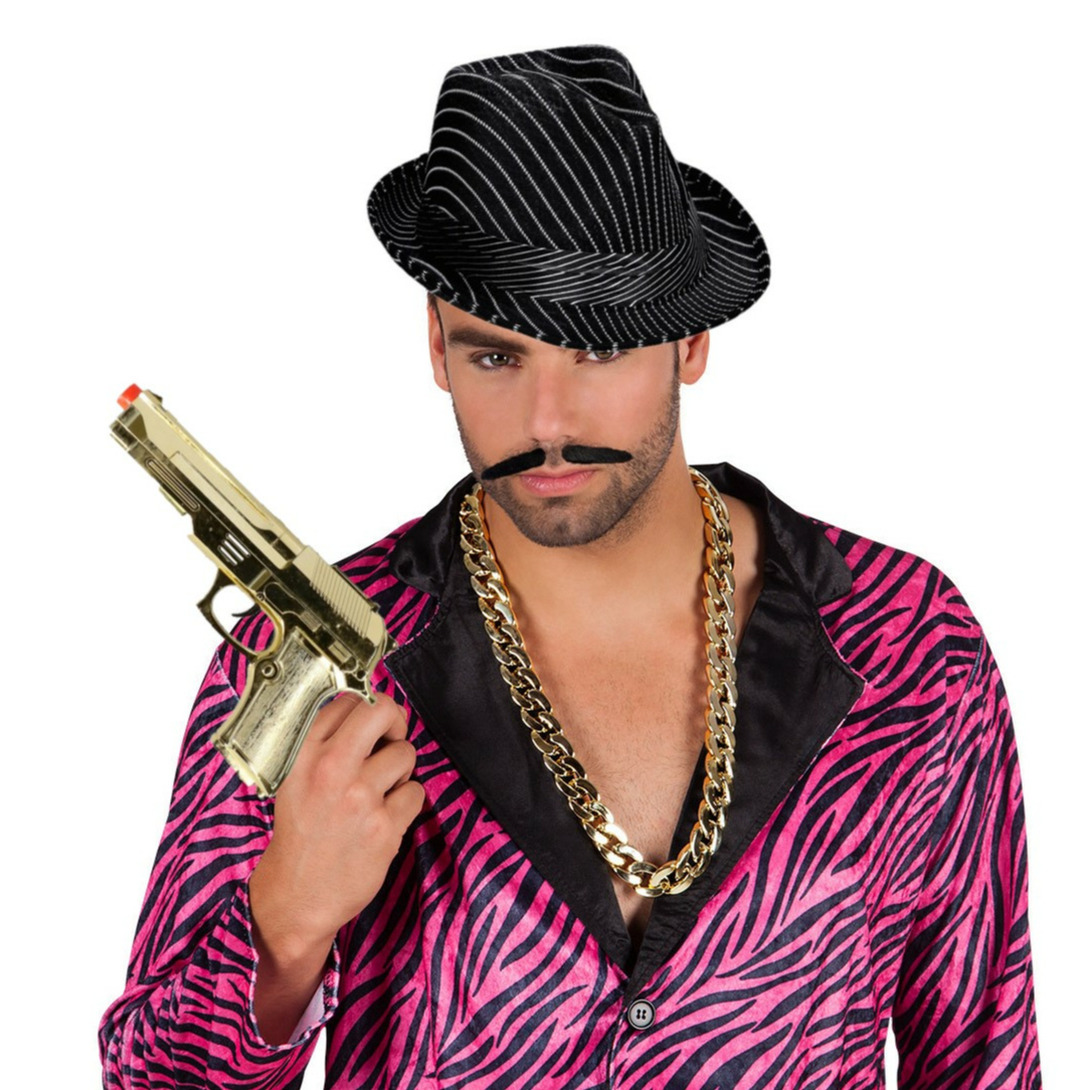 Gangster verkleed spullen set voor heren. Een 4 delige accessoires verkleed set bestaande uit een zwarte gleufhoed, een dun nep snorretje, een gouden pistool, en een gouden schakelketting. Je kan verder je gewone nette kleding zoals overhemd en pantalon gebruiken, maar leuker is een bijpassend verkleedkleding kostuum. Deze kunt u ook in onze winkel vinden. Uit te breiden met: strikje, stropdas, net kostuum, rode roos op rever, dikke sigaren, machinegeweer. , Dit artikel bestaat uit:, 1x Trilby gangster hoed – zwart – krijtstreep – volwassenen – maffia verkleed hoed, 1x Carnaval verkleed snorren – Gangster – zwart – zelfklevende namaak snor, 1x Carnaval/verkleed accessoires Gangster/pimp sieraden – schakel ketting – goud – kunststof, 1x Verkleed speelgoed pistool – goud – geheim agent/gangster thema – 22 cm