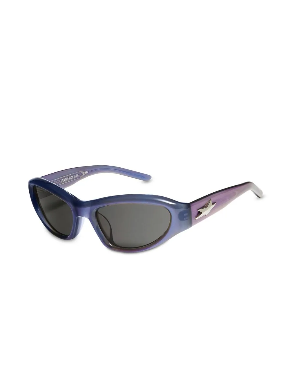 Blauw, acetaat, iriserend effect, biker montuur, gekleurde glazen, logoplakkaat op het pootje en gewelfde pootjes. Deze bril wordt verkocht met een beschermhoes..