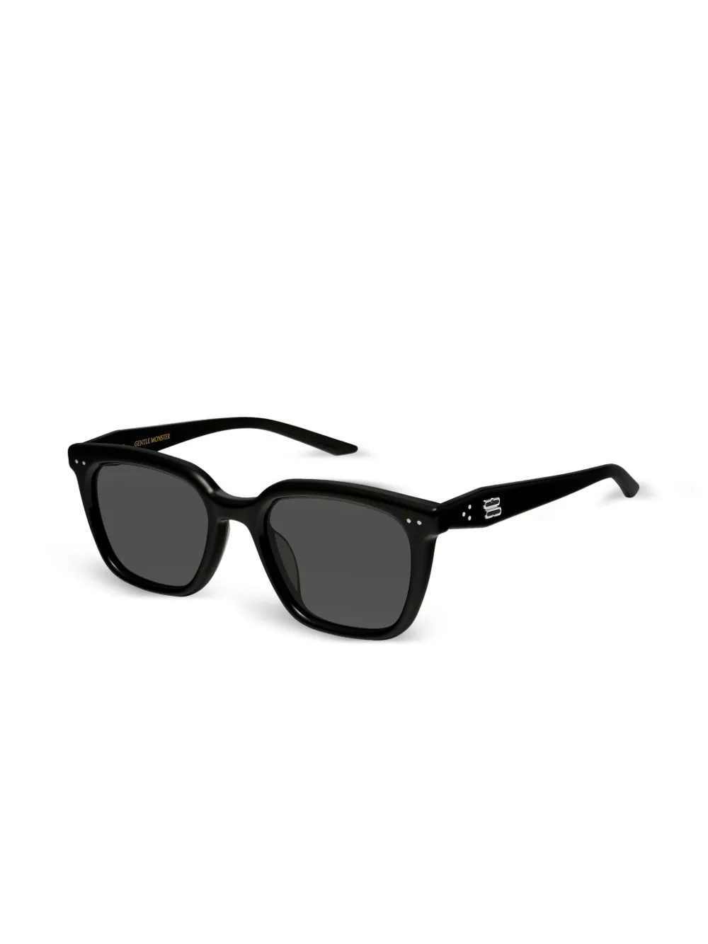 zwart acetaat glanzende finish vierkant montuur grijze glazen glazen met UV-bescherming klinknageldetails gewelfde pootjes gebogen uiteinden Deze bril wordt verkocht met een beschermhoes.