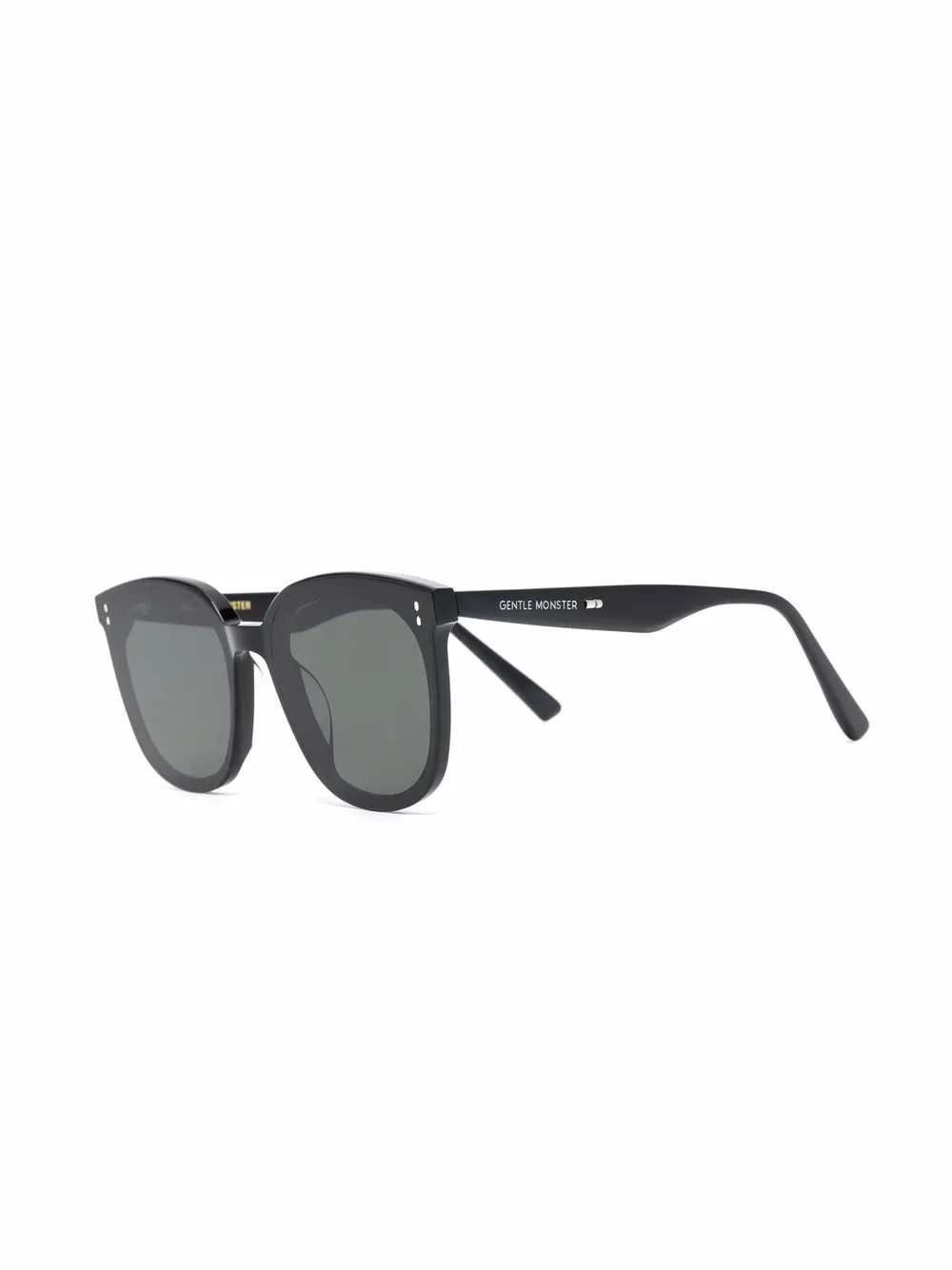 Rond montuur, oversized montuur, grijze glazen, gewelfde pootjes en logoprint op het pootje. Materiaal: acetaat. Deze bril wordt verkocht met een beschermhoes..