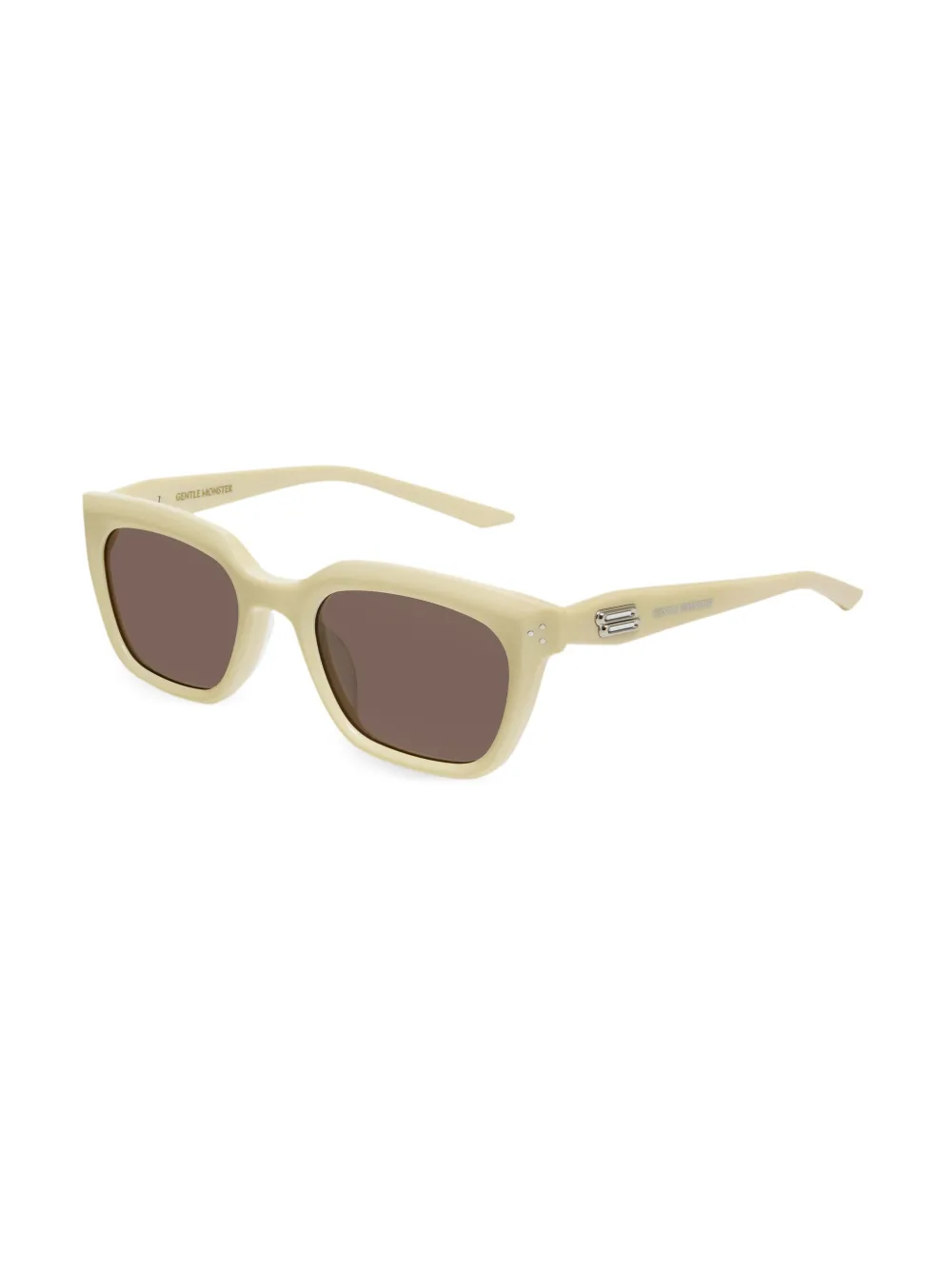 lichtgeel acetaat vierkant montuur bruine glazen logoprint op het pootje metalen details aan de zijkant gebogen uiteinden Deze bril wordt verkocht met een beschermhoes.