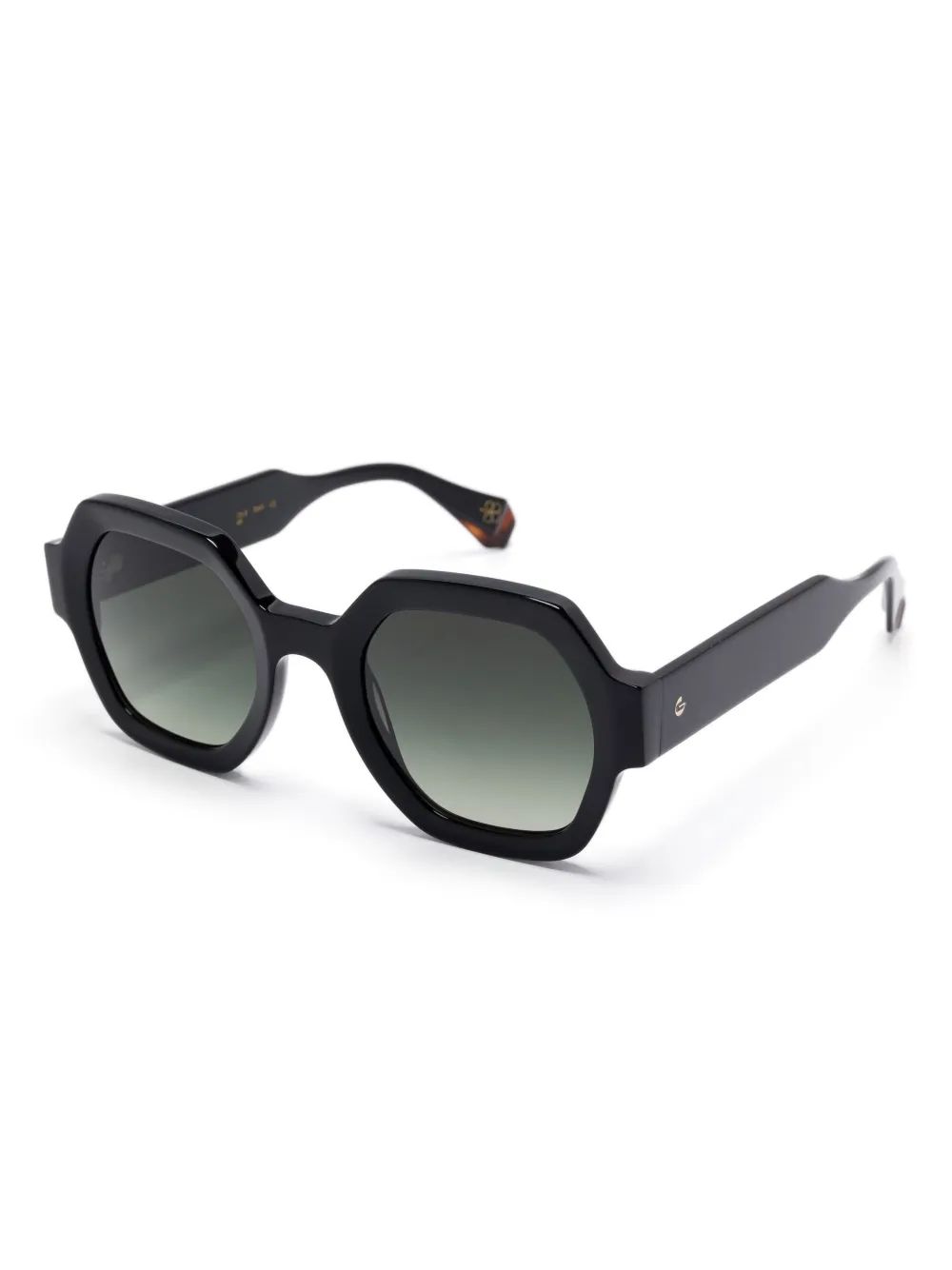zwart pootje met gegraveerd logo geometrisch montuur glazen met kleurverloop glazen met UV-bescherming geschulpte pootjes gebogen uiteinden Deze bril wordt verkocht met een beschermhoes.