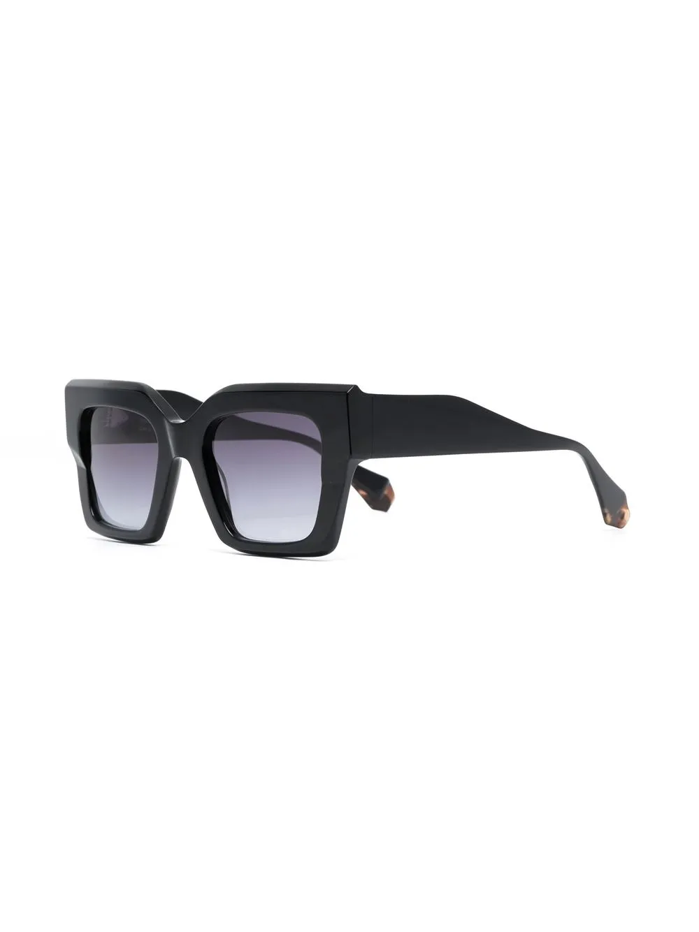 Zwart, acetaat, cat-eye montuur, glazen met kleurverloop, geschulpte pootjes en gebogen uiteinde. Deze bril wordt verkocht met een beschermhoes..