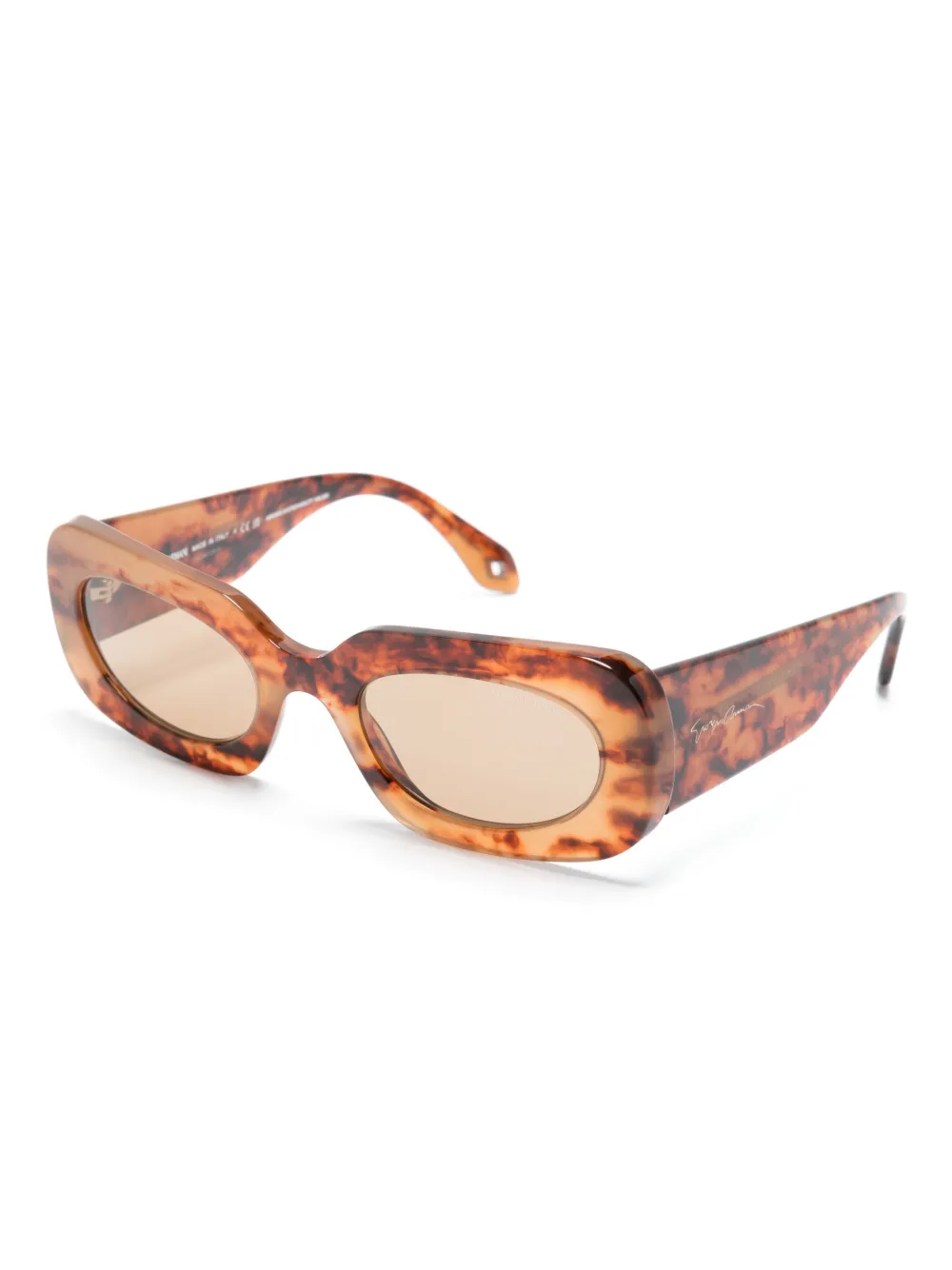 Camel, logoprint op het pootje, vlammenprint, rechthoekig montuur, blauwe glazen, glazen met UV-bescherming, oversized pootjes en gebogen uiteinde. Deze bril wordt verkocht met een beschermhoes..
