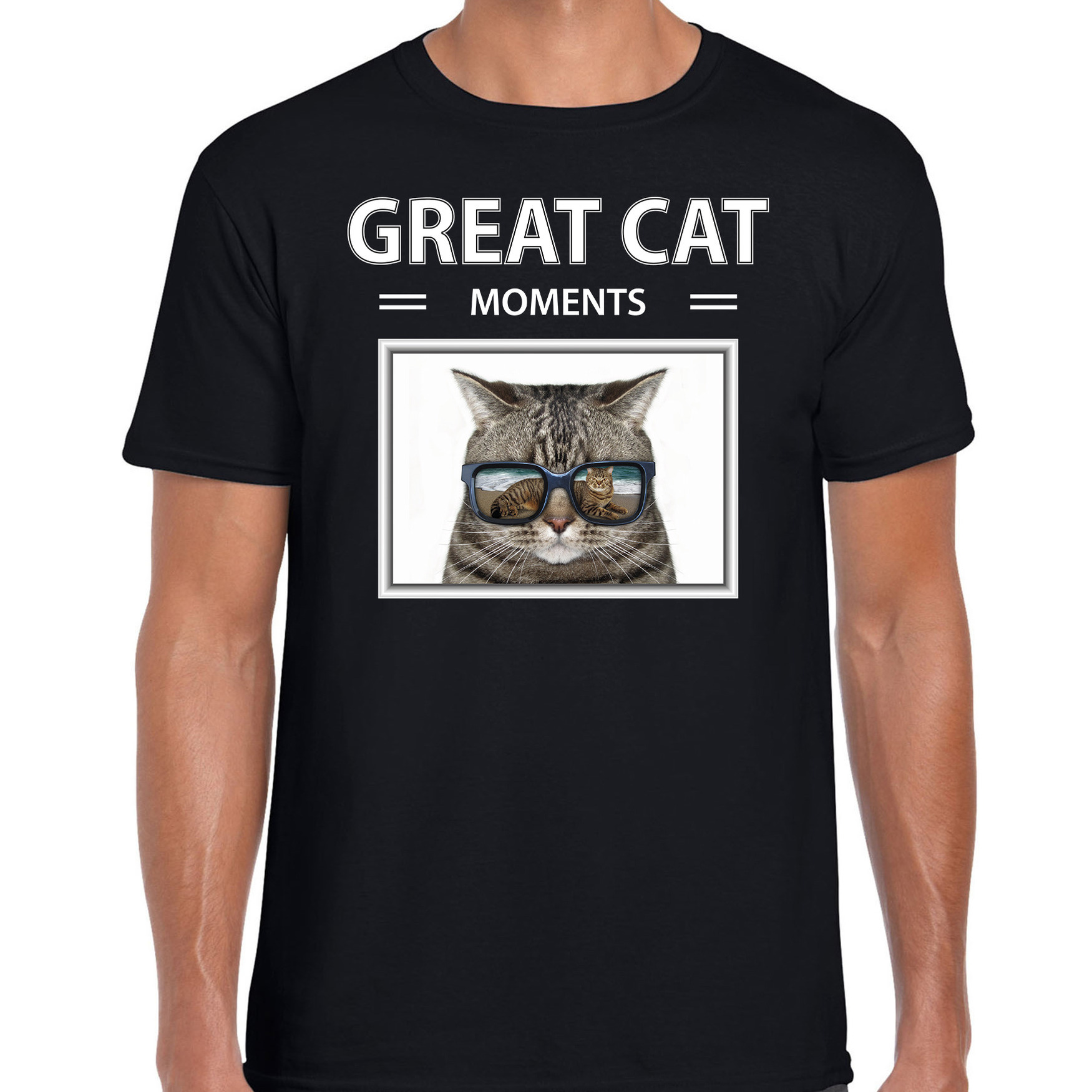 Grijze katten t-shirt met dieren foto great cat moments zwart voor heren. Dit shirt is bedrukt met een foto van een grijze kat die een zonnebril draagt met de tekst: great cat moments. Een gaaf shirt voor een echte natuurliefhebber of iemand die alles van katten / dieren spaart. Erg leuk om cadeau te doen aan een echte kattenmens!