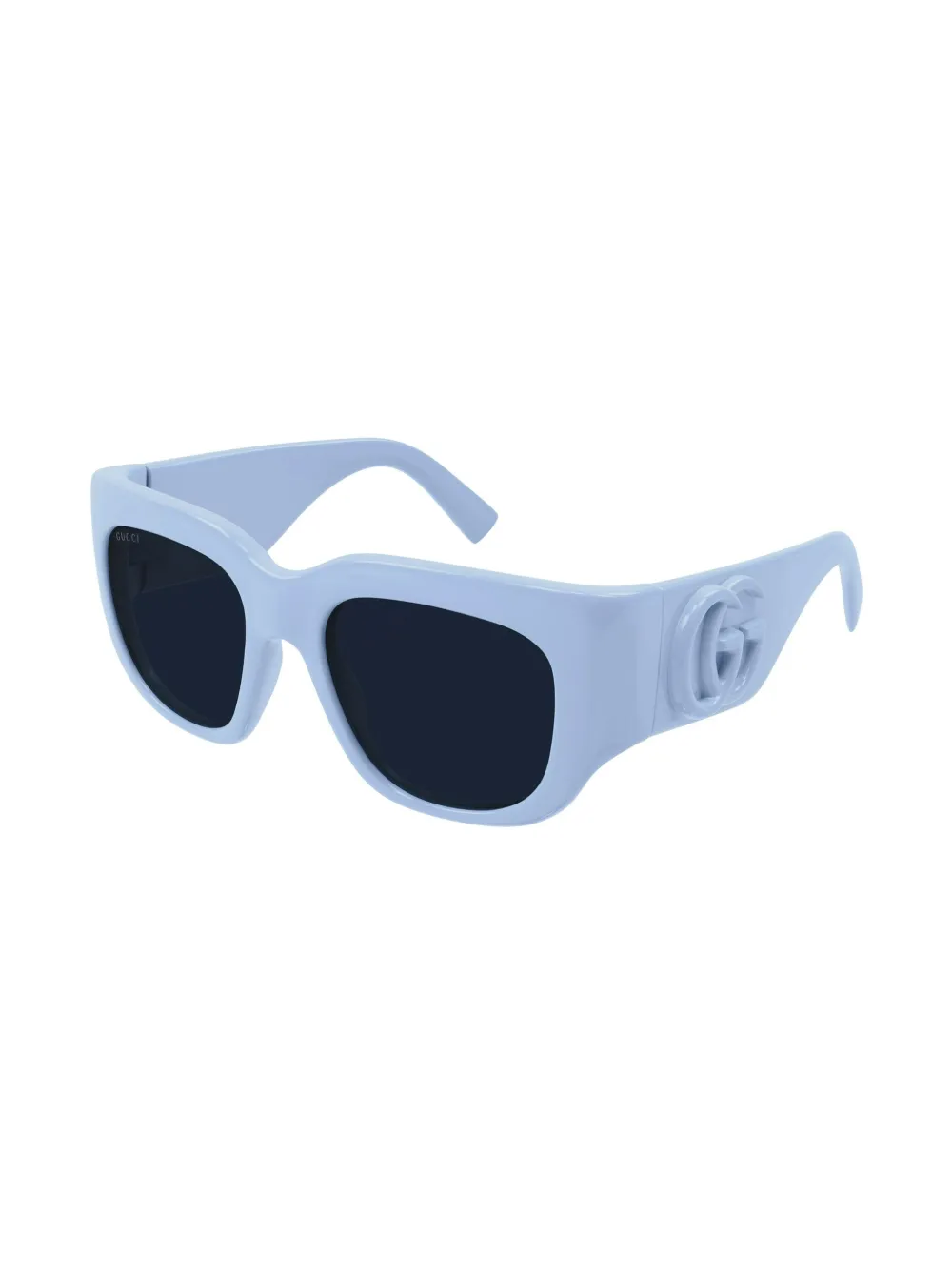 babyblauw acetaat kenmerkend GG-logo oversized montuur grijze glazen rechte pootjes gebogen uiteinden Deze bril wordt verkocht met een beschermhoes.