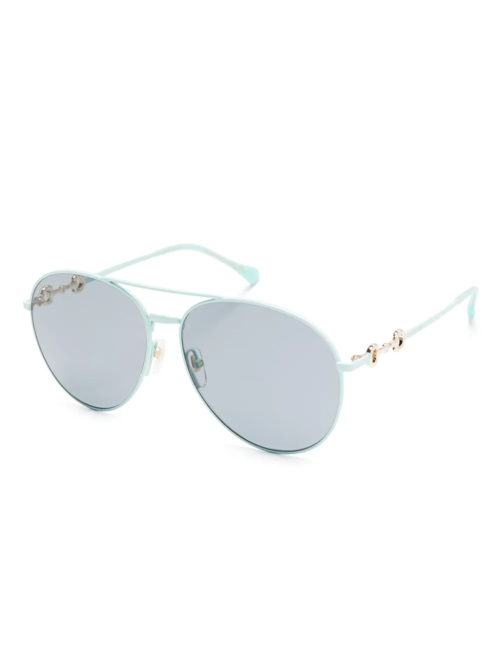aqua blauw metaal piloten montuur glazen met UV-bescherming logo lens sticker dubbele neusbrug neuskussentjes kenmerkend Horsebit detail pootje met gegraveerd logo rechte poten met gebogen uiteinden Deze bril wordt verkocht met een beschermhoes.